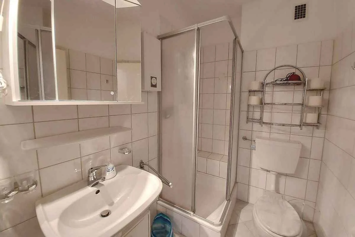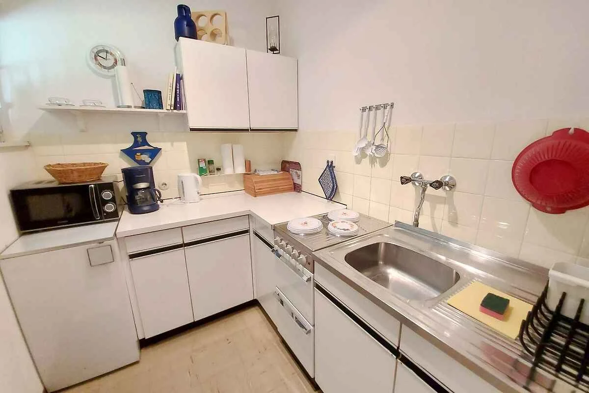 Soggiorno/camera da letto con 2 letti aggiuntivi su divano/sofa, TV, radio, accesso al balcone e con una bella vista sul Grimming e sul Kammspitze. Cucina con fornello elettrico, microonde, caffettiera, tostapane e bollitore elettrico. Bagno con doccia, 1 lavandino e WC.