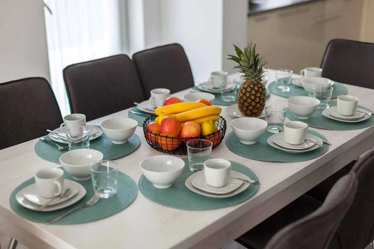 Piano terra: Soggiorno (camera di passaggio) con 1 letto matrimoniale, 1 letto singolo, TV, zona pranzo (8 posti) e accesso alla terrazza (coperto, mobili da giardino, insieme a Sala ricreativa). Camera da letto con TV e accesso alla terrazza (coperto, mobili da giardino, 1 tavolo, 8 sedie, 5 lettini da sole). Cucina americana nella cucina soggiorno (camera di passaggio) con fornello elettrico (piano cottura ceran, 4 fornelli), forno, cappa aspirante, lavastoviglie, frigorifero (scomparto del ghiaccio), microonde, caffettiera, tostapane, bollitore elettrico e accesso alla terrazza. Bagno con doccia, 2 lavandino, WC, bidet e asciugacapelli. WC separato con lavatrice, 1 lavandino e WC.