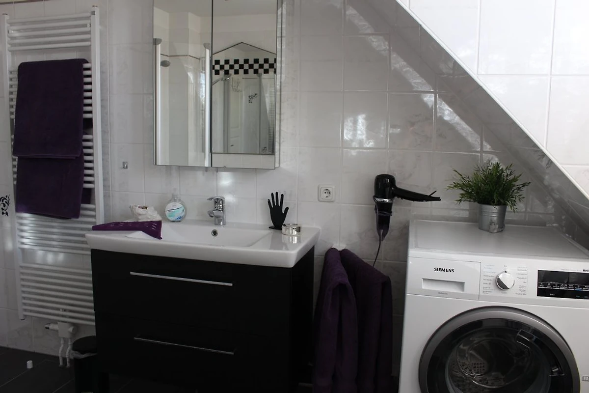 Allo stesso livello si trovano la sala da pranzo con un grande armadio a muro, un moderno bagno con finestra e vasca/doccia, nonché una lavasciuga.