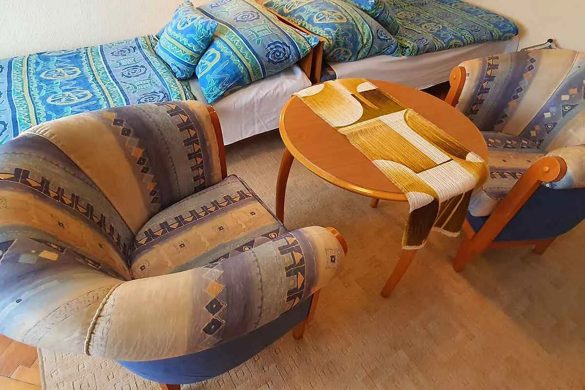 Piano terra: Soggiorno con angolo di seduta, TV e zona pranzo (4 posti). Camera da letto con 2 letti singoli. Cucina con stufa a gas (4 fiamme), forno, frigorifero (150 l, scomparto del ghiaccio), microonde, caffettiera e bollitore elettrico. Bagno con doccia, 1 lavandino, WC e finestra.
