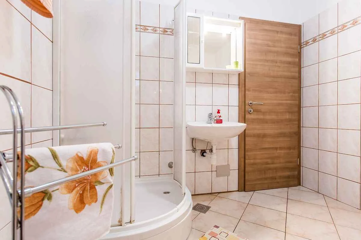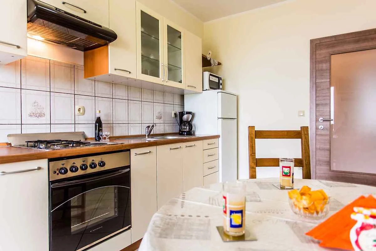 e conduce direttamente nel corridoio con porte di tutte le camere. Camera da letto (10 mq) con 1 letto matrimoniale, TV e accesso alla terrazza (15 mq, mobili da giardino). Camera da letto (8 mq, non riscaldabile) con 1 letto matrimoniale. Cucina nella cucina soggiorno (10 mq) con TV, zona pranzo, stufa a gas (2 fiamme), fornello elettrico (2 fornelli), forno, cappa aspirante, frigorifero (scomparto del ghiaccio), caffettiera, bollitore elettrico e accesso alla terrazza. Bagno (9 mq) con doccia, WC, bidet e finestra. Cucina soggiorno con angolo di seduta e TV.