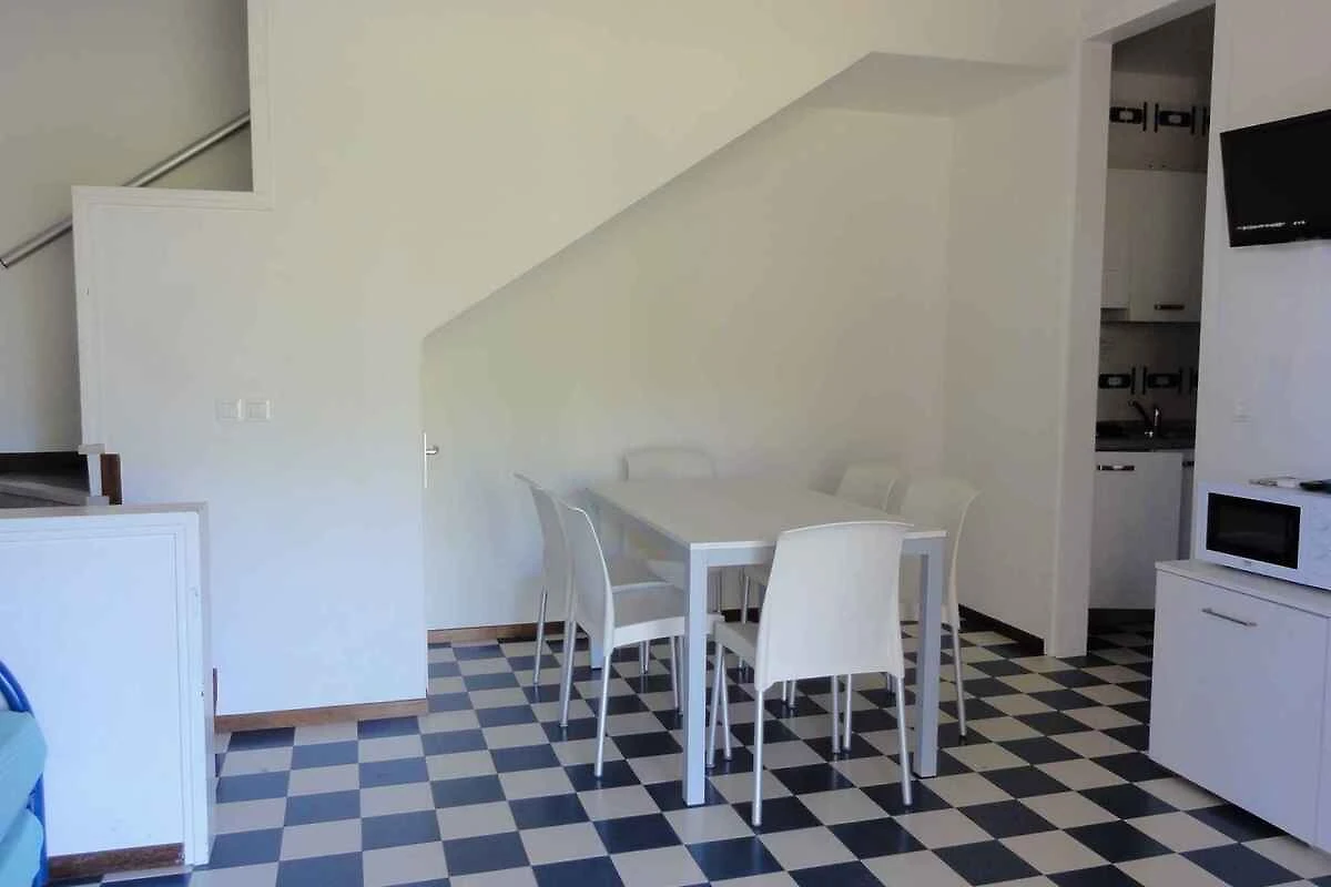 Piano terra: Soggiorno (camera di passaggio) con 2 letti aggiuntivi su divano/sofa, TV, zona pranzo (6 posti) e accesso alla terrazza (mobili da giardino, 1 tavolo, 4 sedie). Camera da letto con 1 letto singolo. Angolo cucina con stufa a gas (4 fiamme), frigorifero (scomparto del ghiaccio) e microonde.