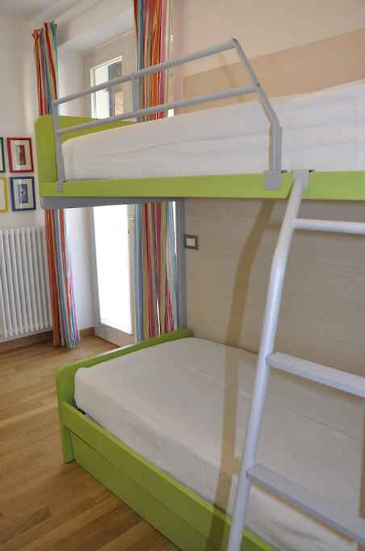 e conduce sopra una scala interna direttamente nel soggiorno nella cucina abitabile. Soggiorno/camera da letto con TV e accesso al balcone. Camera da letto con 1 letto aggiuntivo, 1 letto a castello e accesso al balcone. Camera da letto con 1 letto matrimoniale e accesso al balcone. Angolo cucina nella cucina soggiorno con stufa a gas (4 fiamme), lavastoviglie e frigorifero. Bagno con doccia, 1 lavandino, WC e bidet.