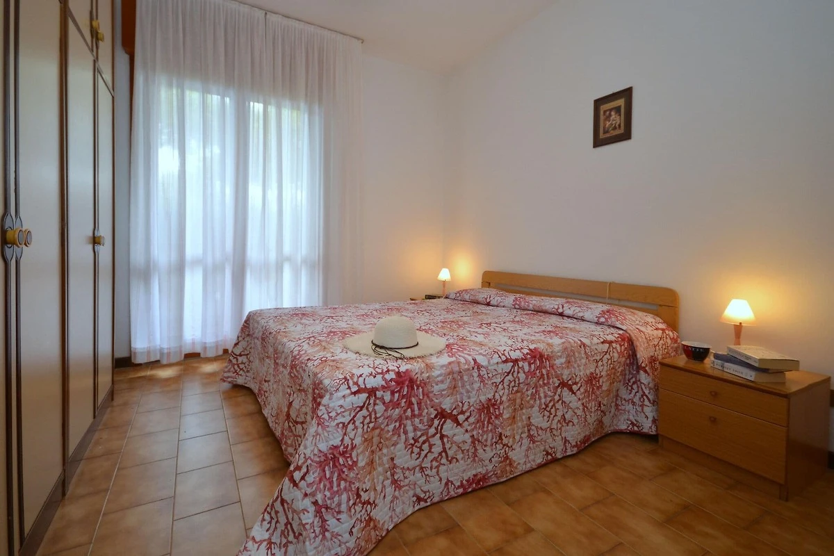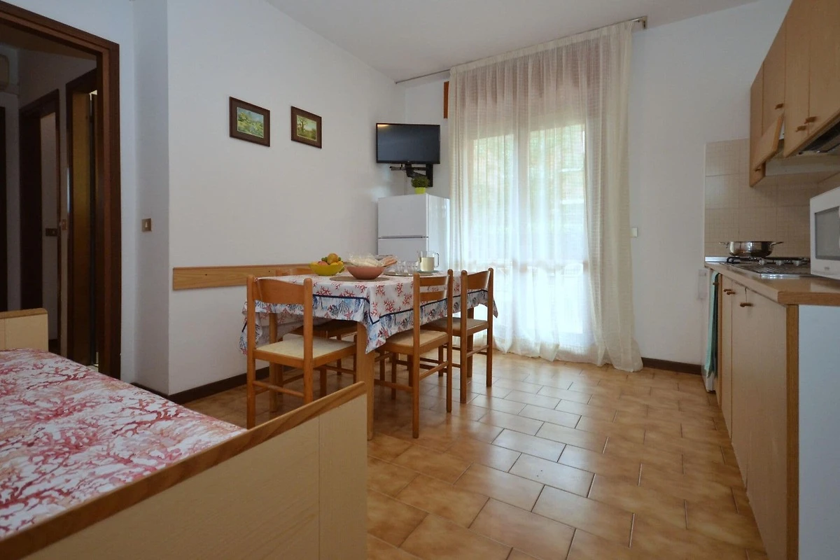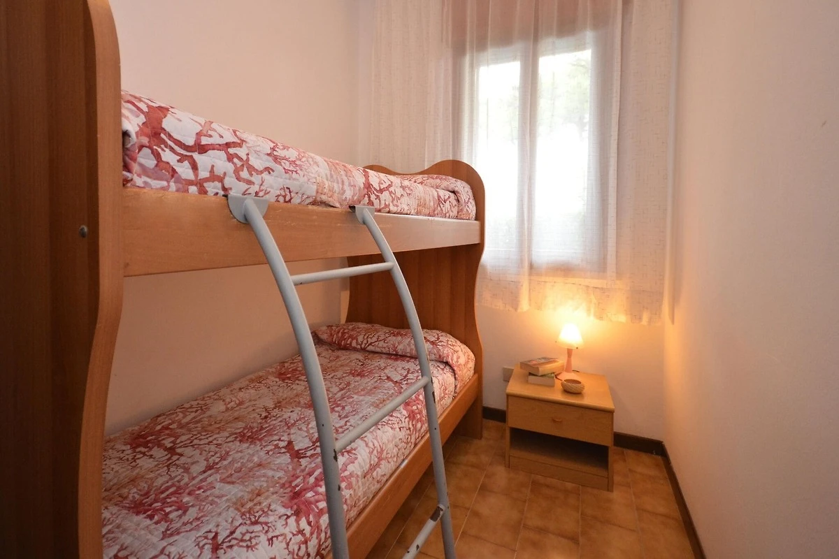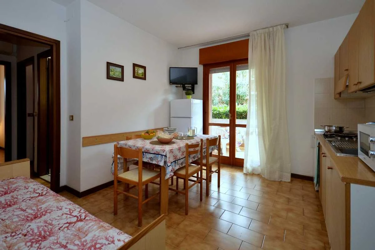 Soggiorno(divano letto singolo, TV), Armadio cucina(piano cottura(4 fuochi, gas, elettrico), caffettiera, forno a microonde, frigorifero), Camera da letto(letto matrimoniale), Camera da letto(letto a castello), Bagno(doccia, WC, bidet), balcone o terrazza, riscaldamento(attraverso l'aria condizionata), aria condizionata, mobili da giardino, lettini prendisole, parcheggio, ombrellone, piscina(in comune con altri ospiti, all'esterno, aperta da Giu fino a 1/2 Set compreso), ascensore, baby crib(paid)