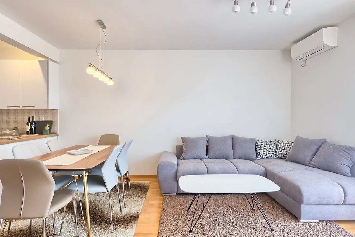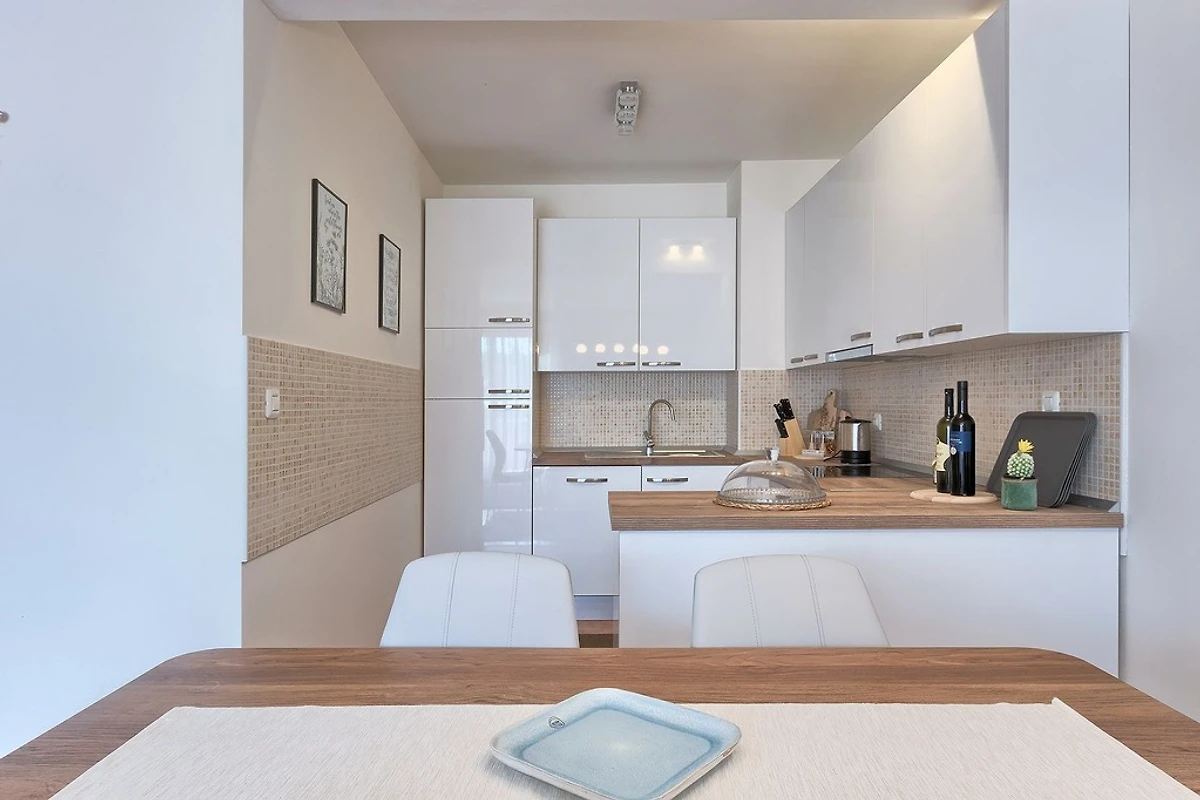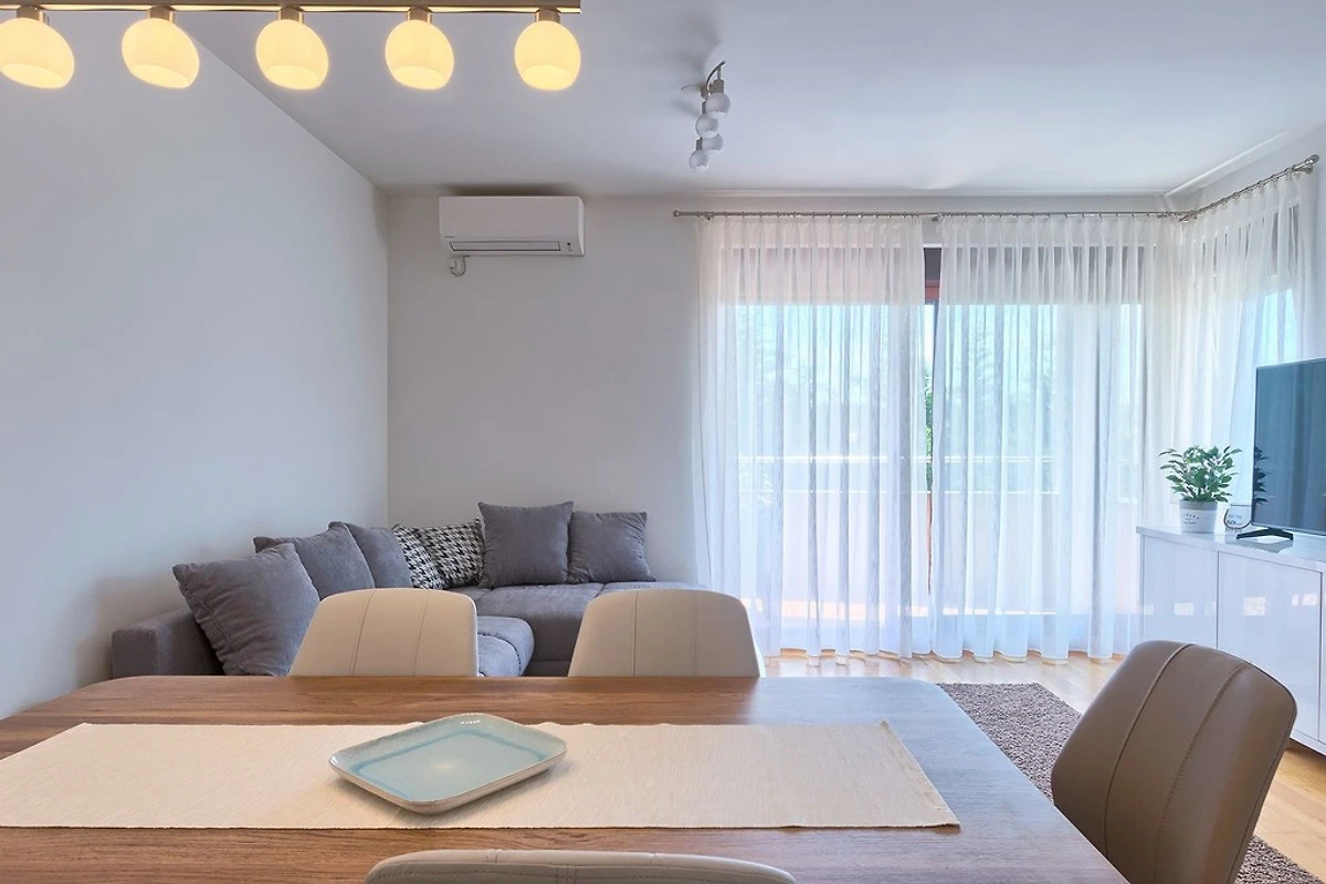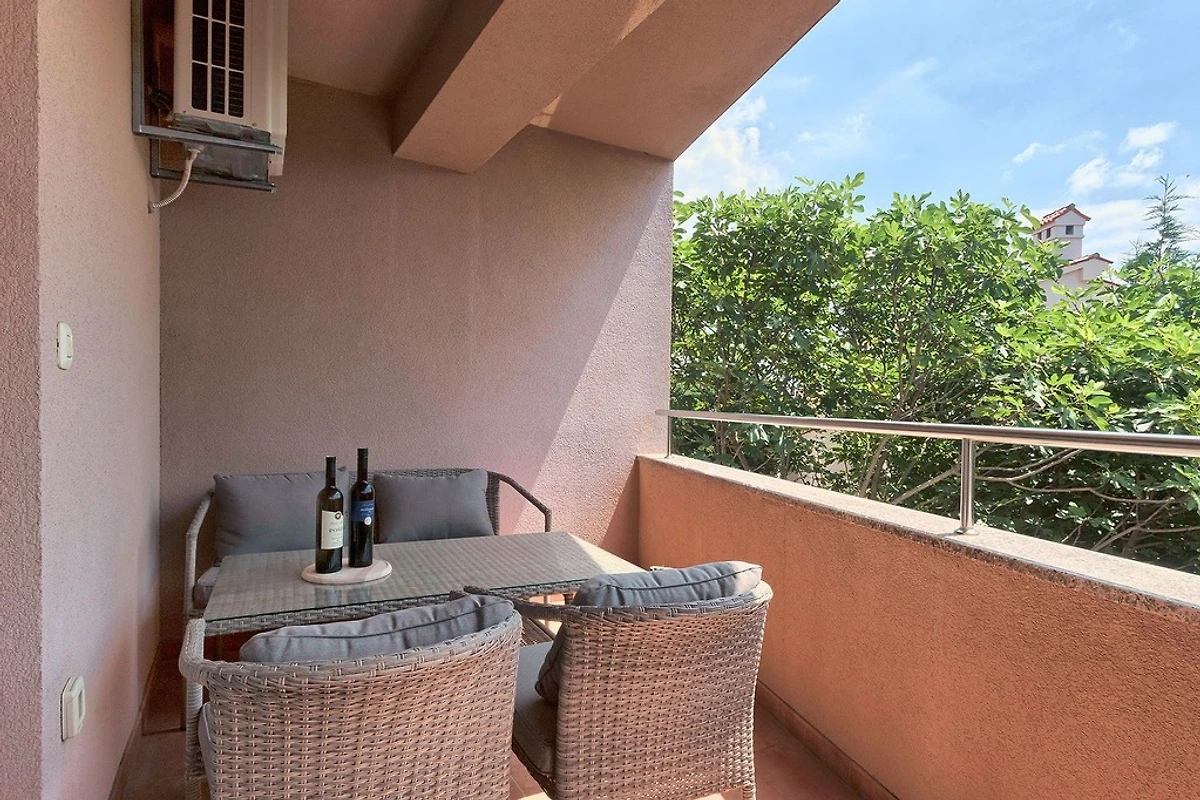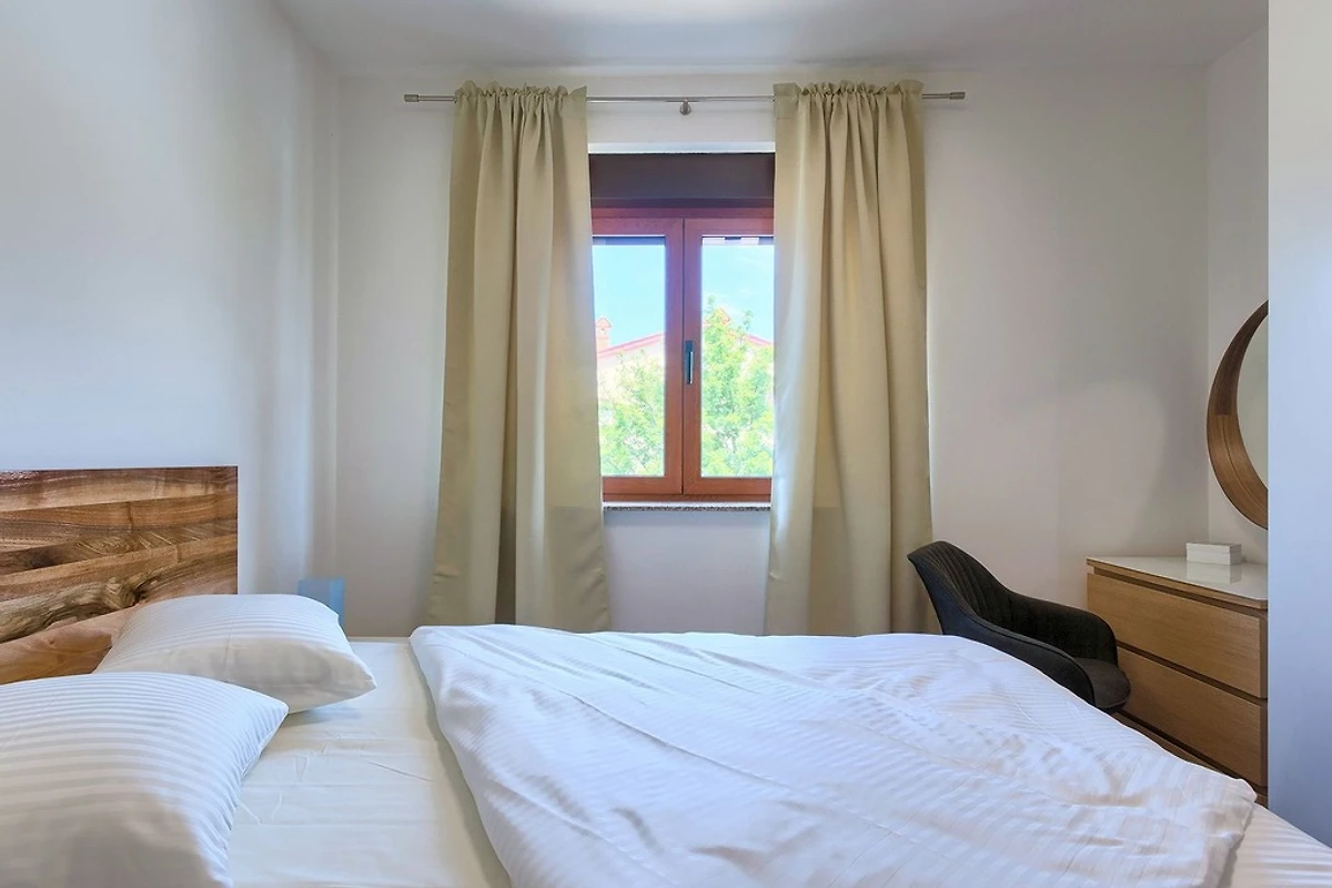 Appartamento con due camere da letto a Ližnjan al secondo piano. L'appartamento climatizzato è composto da una cucina completamente attrezzata e da un soggiorno con accesso diretto alla terrazza. Due camere da letto, un bagno e una dispensa. Parcheggio davanti all'edificio, grande piscina comunale disponibile. L'appartamento si caratterizza per la sua qualità, la sua bellissima posizione nella natura. Per una vacanza perfetta in famiglia e in assoluta tranquillità. La vicinanza della città turistica di Medulin con numerosi ristoranti, il lungomare e altre strutture assicura interessanti serate mediterranee della vostra vacanza.