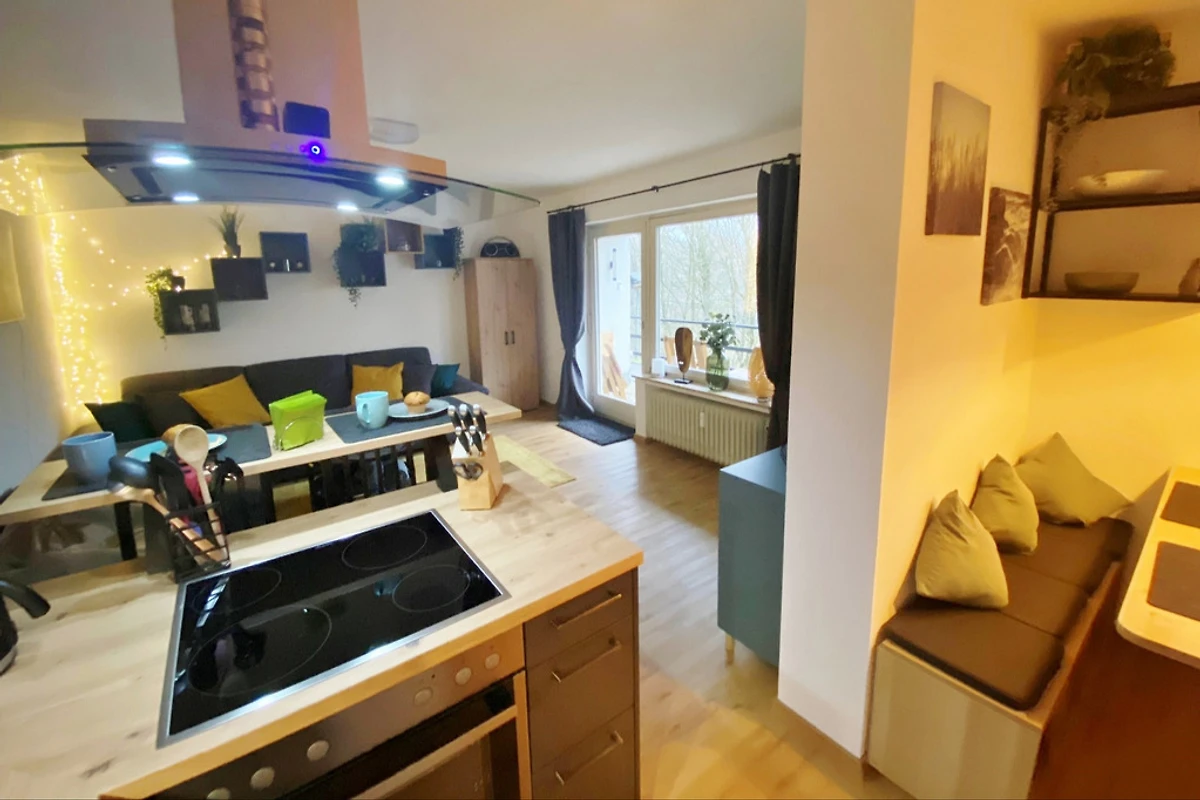 - Cucina aperta con buone attrezzature: macchina per il caffè, montalatte, tostapane, bollitore, microonde, bar e zona pranzo - Camera da letto con letto matrimoniale (160x200), armadio (seggiolone/letto per bambini disponibile senza biancheria) - Terrazza con posti a sedere e tenda da sole - Moderno bagno con doccia walk-in, scaldasalviette e asciugacapelli - Parcheggio davanti alla porta - campo per biciclette con serratura; cantina per gli sci In questa struttura è necessario portare con sé lenzuola e asciugamani. Un terzo letto è disponibile sul divano letto del soggiorno. Culla/seggiolone: sono disponibili gratuitamente con materasso e piumone - portare la propria biancheria da letto La connessione Wi-Fi dovrebbe essere disponibile da aprile L'area esterna della proprietà, costruita negli anni '70, non è ancora stata rinnovata e non corrisponde all'ambiente contemporaneo.