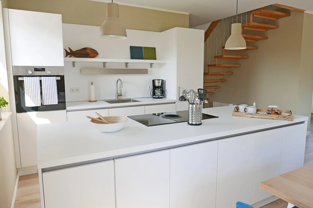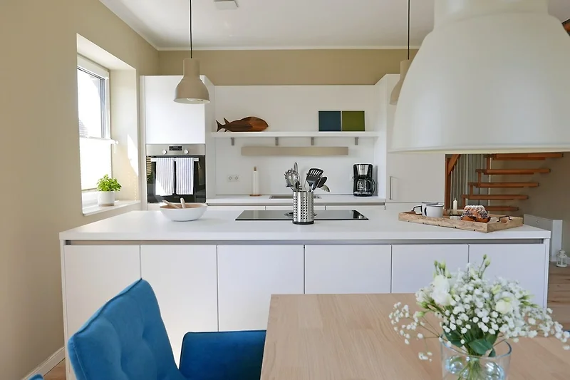 Un punto forte della bifamiliare è sicuramente la modernissima cucina con isola di cottura, aperta sulla zona giorno: Qui i cuochi per hobby avranno pane per i loro denti! È facile preparare pasti gustosi, perché la cucina dispone di tutti gli elettrodomestici necessari per una vacanza confortevole.