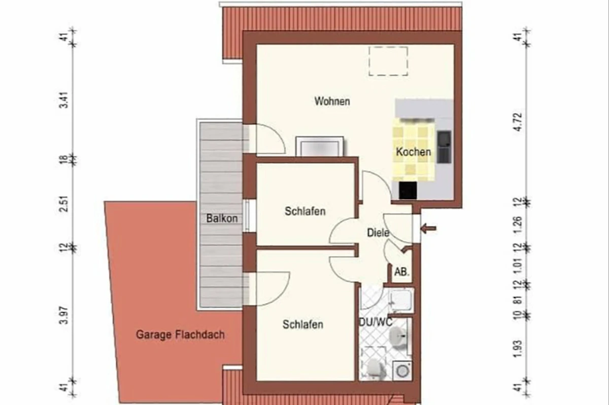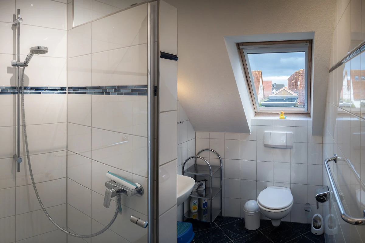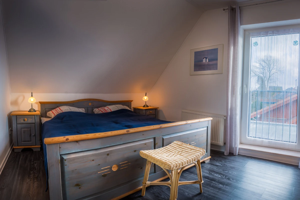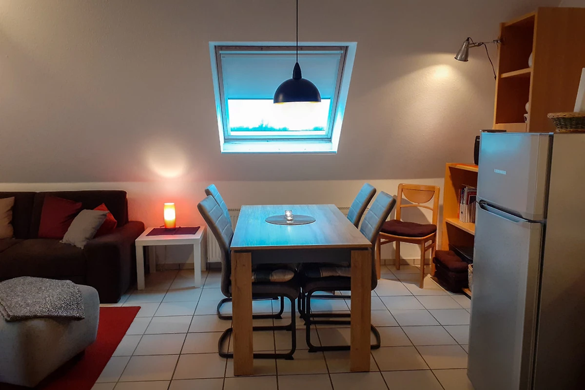 Appartamento per vacanze di circa 45 m², arredato in modo confortevole, al piano superiore della casa con balcone esposto a sud, ai margini del campo. 2 camere da letto separate; accogliente zona giorno con SAT/TV; angolo cottura completamente attrezzato (incl. lavastoviglie) con zona pranzo; bagno con doccia/WC; lettino da viaggio e seggiolone a disposizione; parcheggio dalla casa; sauna (a pagamento); uso di lavatrice e asciugatrice (a pagamento); ping-pong; appartamento per non fumatori; garage per biciclette o carretti a mano in comune.
