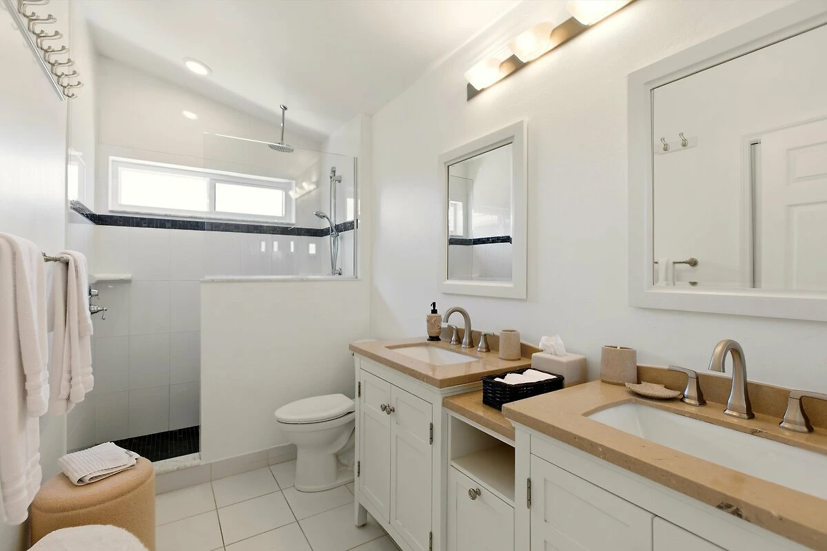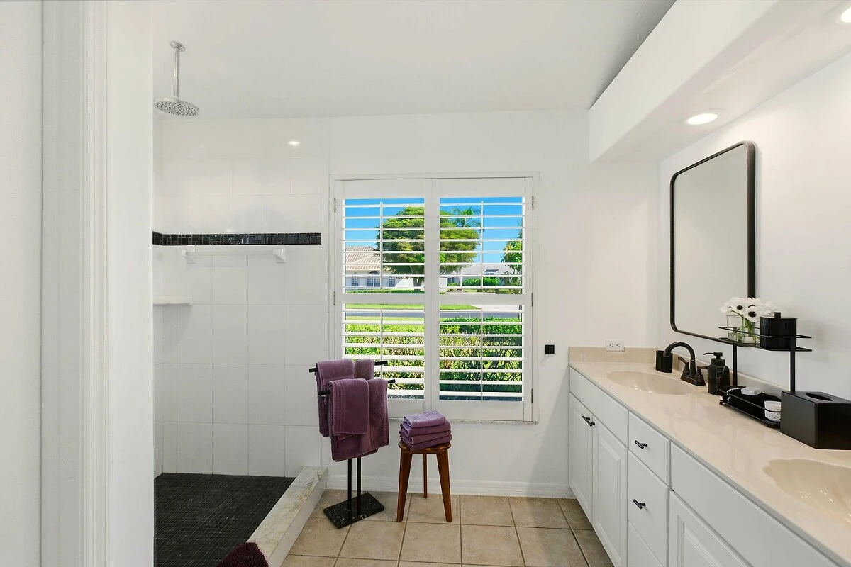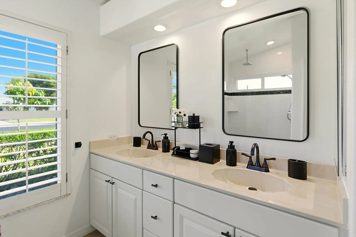 Il bagno degli ospiti è dotato di una doccia walk-in, di un nuovo vanity bianco brillante con piano in granito e si trova tra le due camere da letto degli ospiti nell'ala degli ospiti sull'altro lato della villa. Questa disposizione delle camere è ideale se viaggiate con una coppia di amici e volete che ognuno abbia la propria area separata.
