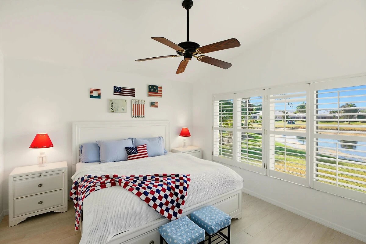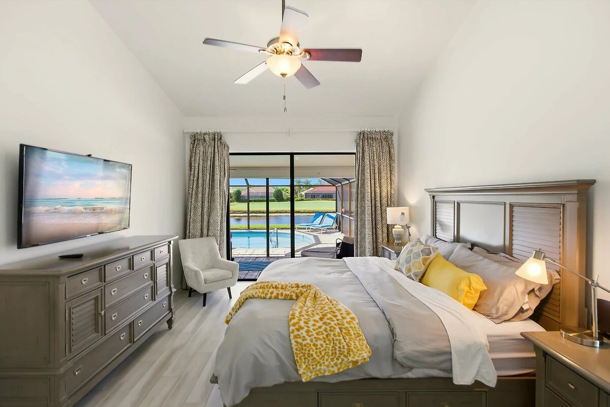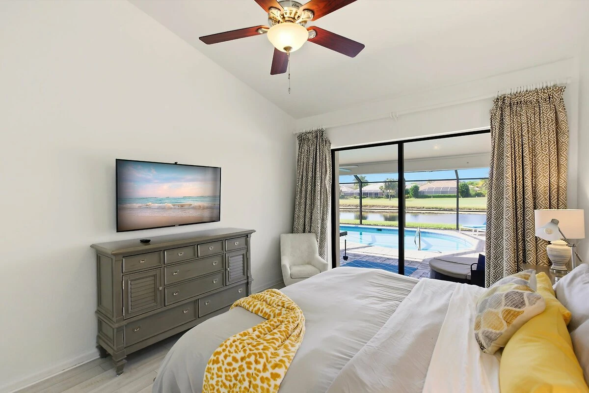 La camera da letto principale ha un letto king size con un comodo materasso pillow top in memory foam. Dispone inoltre di una TV LED a schermo piatto con connessione via cavo e colpisce per la vista estremamente generosa sulla piscina illuminata a scelta e sul giardino tropicale con vista lago.