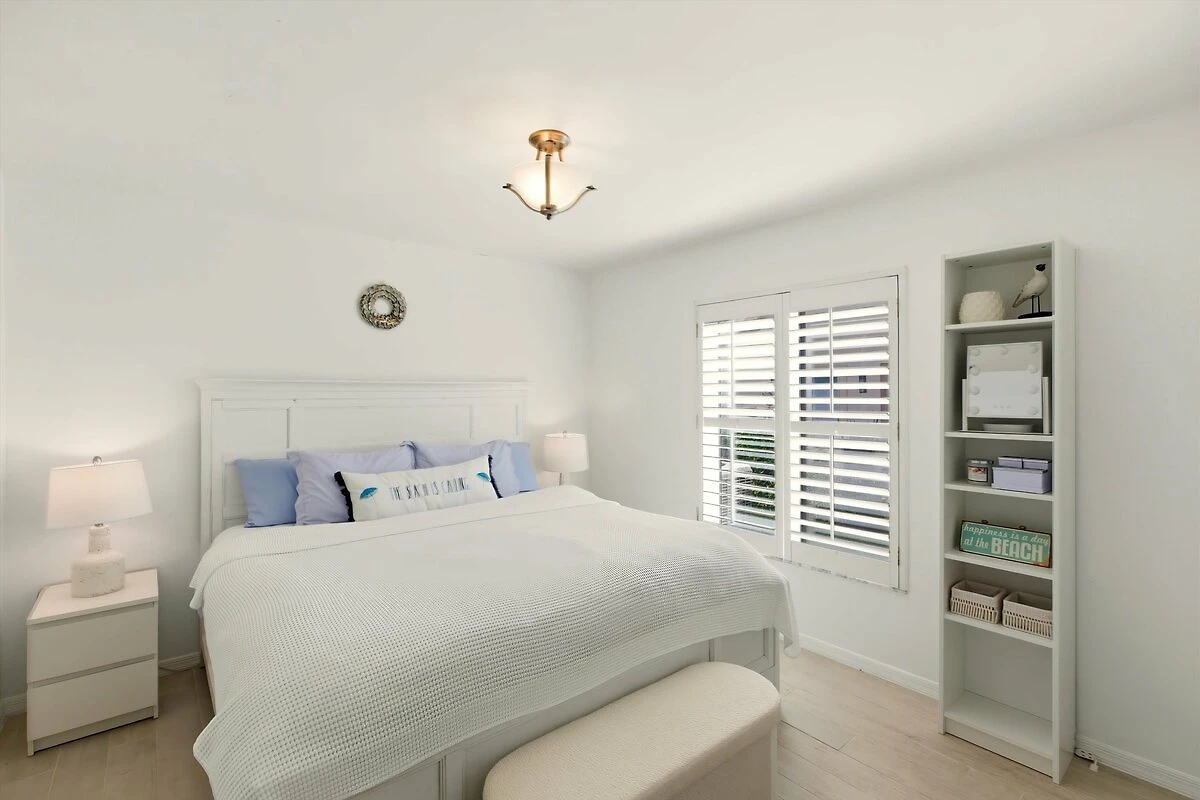 Anche la camera 2 dispone di un letto queen size in stile Coastal Beach, di colore bianco brillante.