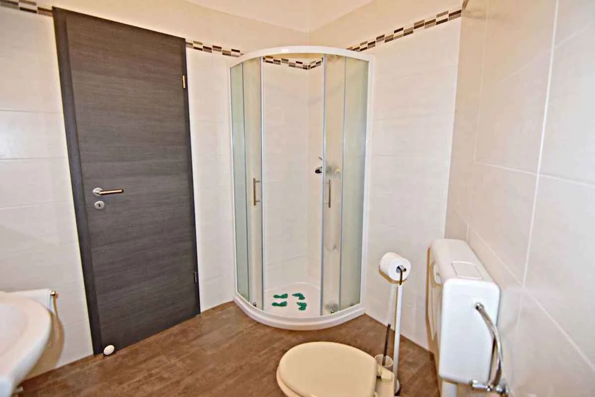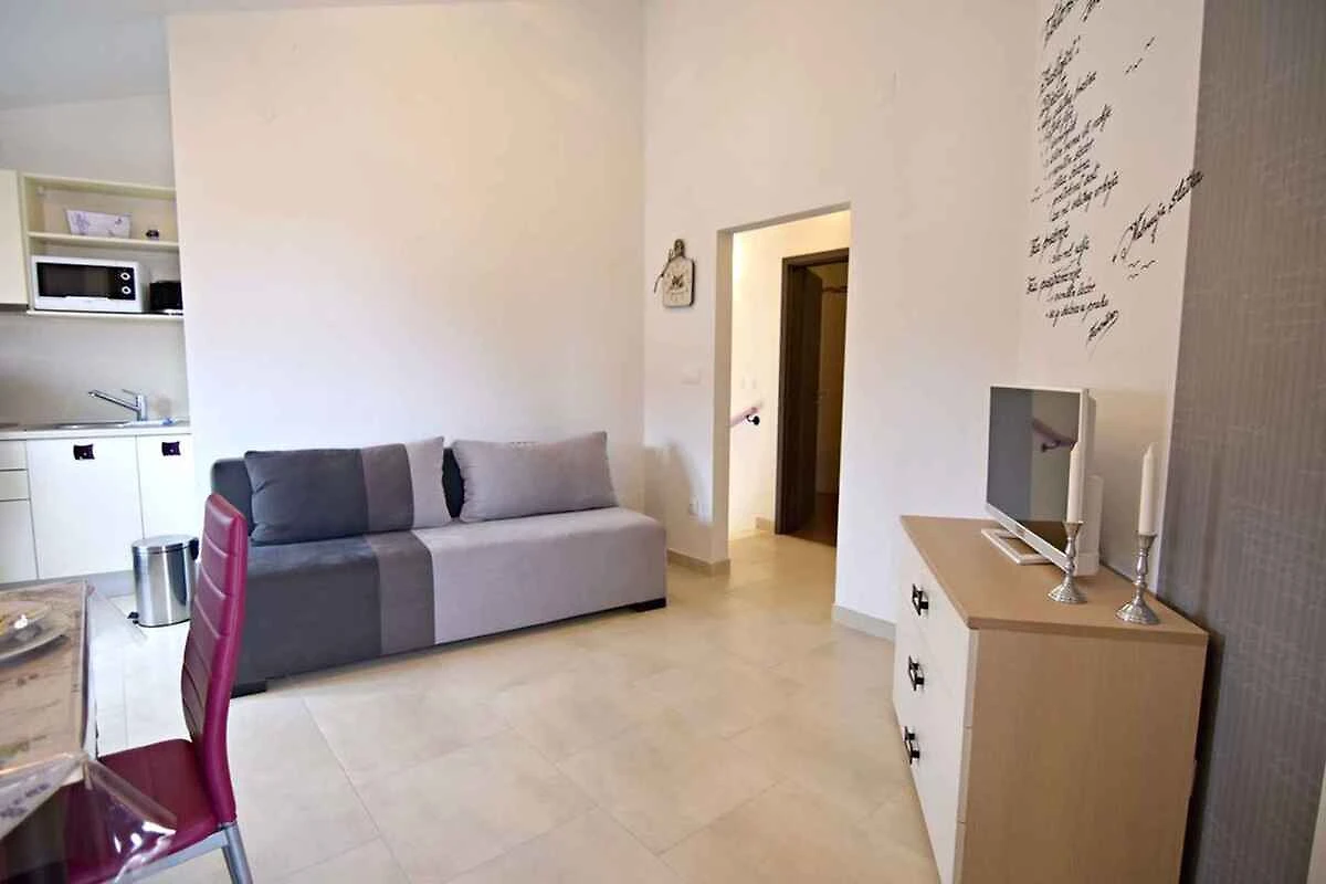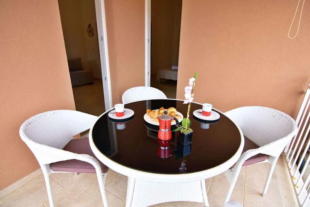 e conduce direttamente nel soggiorno. Sala ricreativa (camera di passaggio) con 1 letto aggiuntivo su divano/sofa, TV e accesso alla terrazza (insieme a Sala ricreativa). Camera da letto con 1 letto matrimoniale. Angolo cucina nella cucina soggiorno (camera di passaggio) con TV, zona pranzo (4 posti), fornello elettrico (2 fornelli), frigorifero, microonde, caffettiera, tostapane, bollitore elettrico e accesso alla terrazza. Bagno con doccia, 1 lavandino, WC, bidet e asciugacapelli.