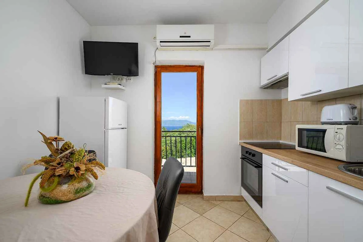 Labin, frazione Drenje. L'appartamento per le vacanze si trova su un terreno di 900 mq. Il locatore abita in un edificio separato sulla proprietà. L’accesso avviene tramite una strada secondaria. Parcheggio (per 1 auto) sulla proprietà.