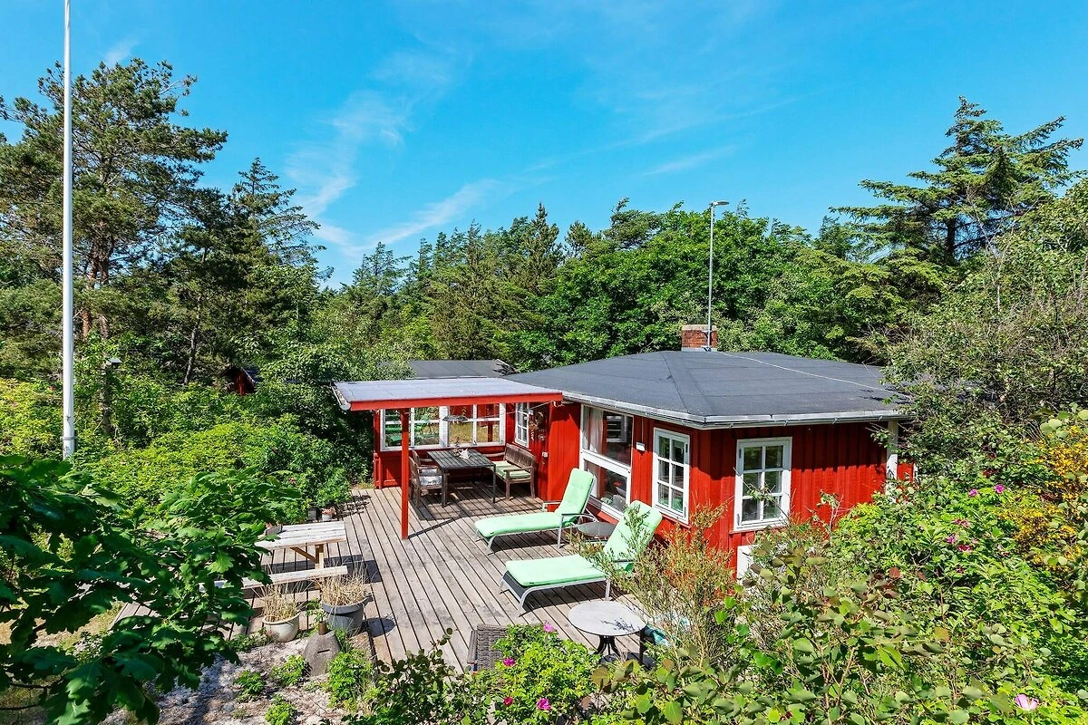 Graziosa casetta situata su un terreno recintato vicino alla bellissima spiaggia del Mare del Nord e vicino alla città di Blokhus. La cucina è aperta sul soggiorno con TV, lettore DVD, radio e internet wireless. Il divano nel soggiorno può essere trasformato in un letto di 1,40 x 2,00 metri. C'è anche una stufa a legna e una pompa di calore a risparmio energetico. C'è una camera da letto matrimoniale. C'è il riscaldamento a pavimento in bagno. La casa dispone di una dependance con due camere da letto, ciascuna con letto matrimoniale. Ci sono 25 m & # 178; terrazzo scoperto. C'è un'altalena. La casa si trova su un 1000 m & # 178; grande appezzamento in foresta / piantagione ca. 400 mt dal mare.