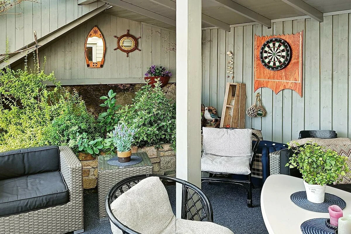 La posizione direttamente sull'acqua con vista sul fiordo, da sogno! / L'arredamento di alta gamma come ad esempio 2 grandi bagni con doccia, grande tavolo da pranzo per 8 persone, grande cucina ben attrezzata, veranda con bersaglio per freccette, barbecue a gas, diverse aree salotto all'aperto su vari livelli e molto altro ancora.