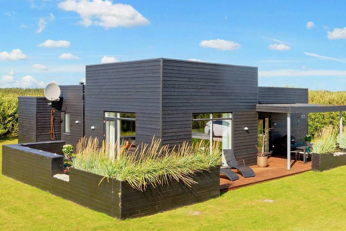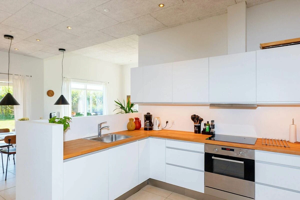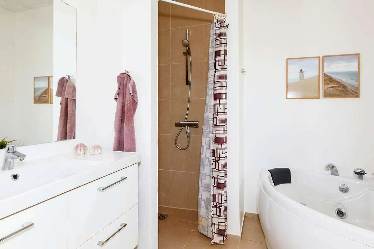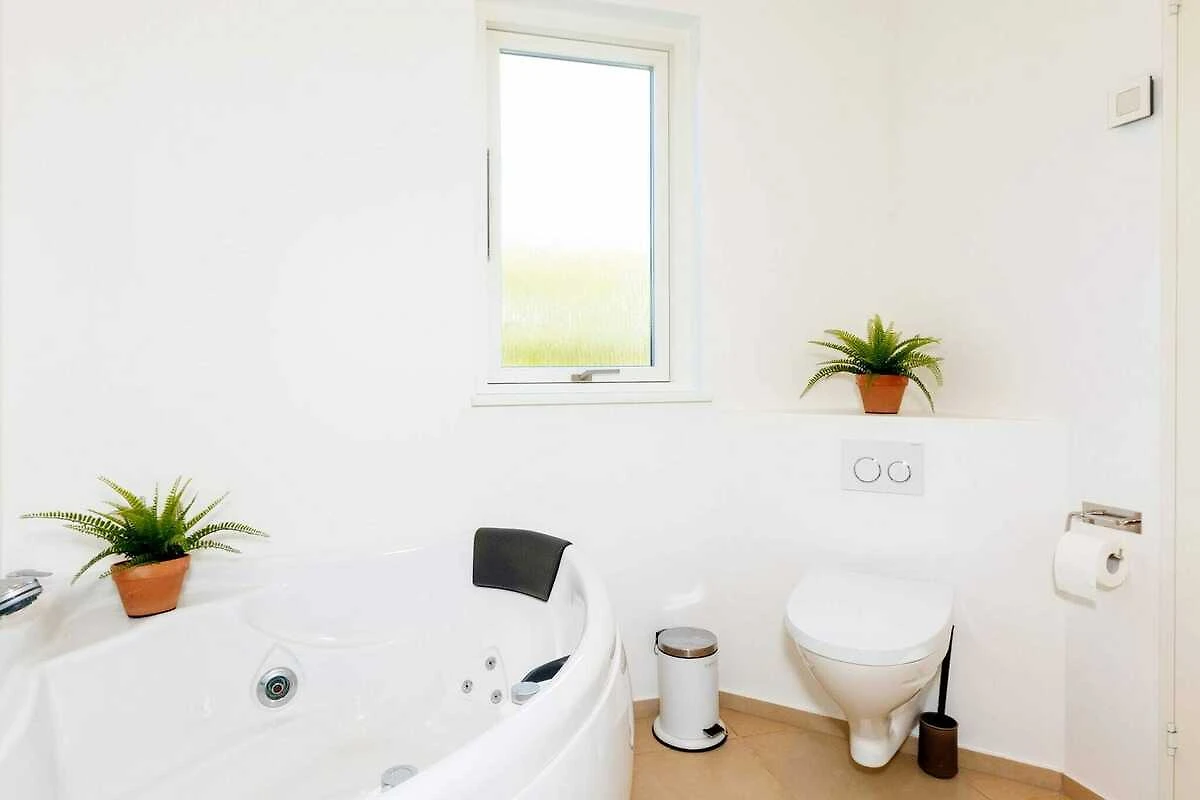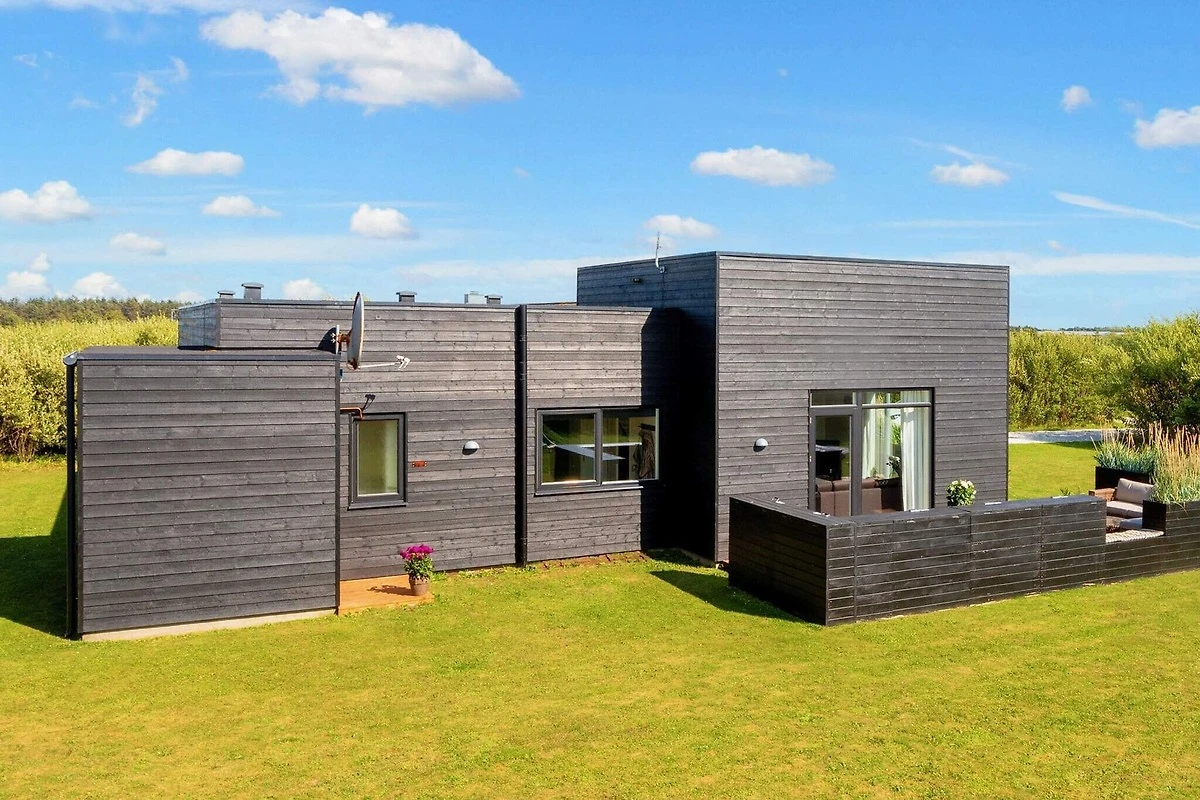 Magnifica villetta con idromassaggio situata a ca. A 600 metri dal mare e dalla spiaggia in una tranquilla zona di villeggiatura a nord di Løkken. Il casolare è arredato con soggiorno/cucina in collegamento aperto, quattro ampie camere da letto, due bagni e ripostiglio. La casa ha un'altezza del soffitto molto alta, che rende la zona giorno insolitamente luminosa e accattivante. L'arredamento è di buon gusto, leggero e moderno e pone l'accento sulla qualità, il benessere e l'intimità. L'illuminazione alogena è stata installata. La casa è dotata di una pompa di calore aria-acqua che alimenta tutti gli ambienti con riscaldamento a pavimento e contribuisce ad un consumo energetico molto contenuto. Dalla zona giorno si accede direttamente al terrazzo di circa 50 mq, che confina con il grande appezzamento naturale con belle possibilità di gioco con la palla. Non in affitto a gruppi di giovani.