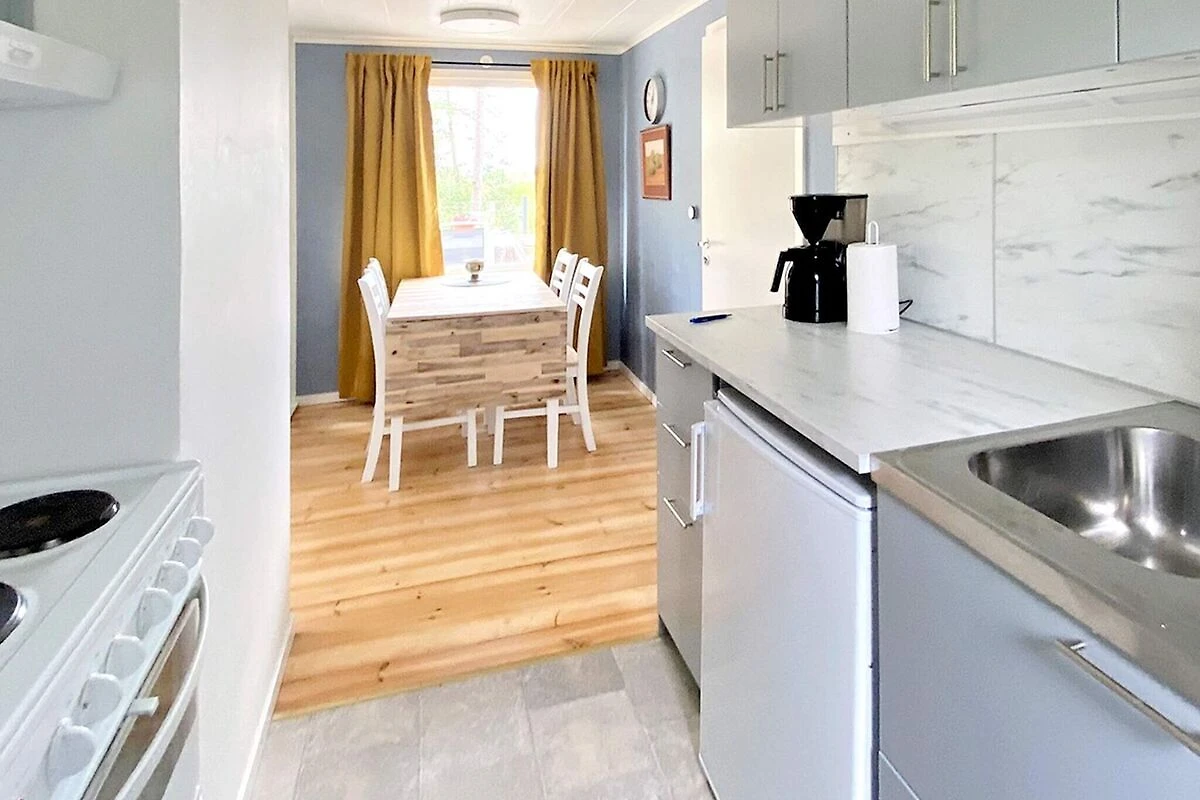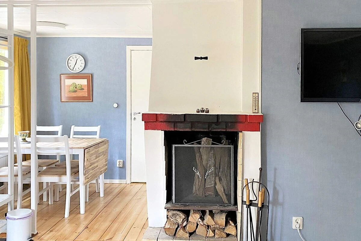 Salotto(letto matrimoniale, brandina doppia), Angolo cottura(mobile cucina(elettrico), cappa aspirante, caffettiera, forno, forno a microonde, acqua dal pozzo), Soggiorno/camera da letto(TV(canali TV svedesi), caminetto), Camera da letto(letto singolo), Bagno(lavabo, doccia, WC), riscaldamento(elettrico), mobili da giardino, barbecue, parcheggio
