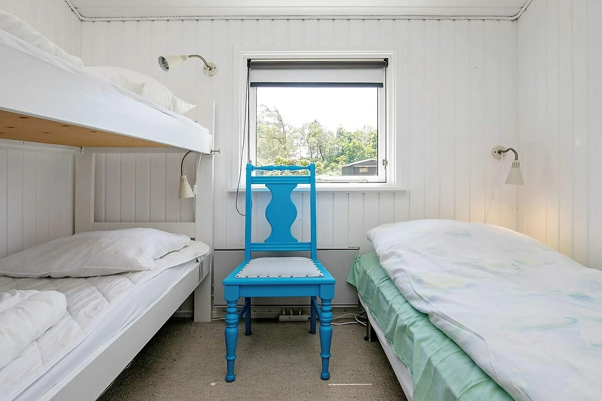 , Angolo cottura(mobile cucina(elettrico), cappa aspirante, caffettiera, frigorifero(+ congelatore)), Soggiorno/camera da letto(TV(canali televisivi tedeschi, canali TV danesi), lettore DVD, radio, lettore CD, impianto stereo, seggiolone), Camera da letto(letto matrimoniale, lettino con sponde), Camera da letto(letto singolo, 2x letto a castello), Bagno(sotto pavimento)(vasca o doccia, lavabo, WC), riscaldamento(elettrico), terrazza, terrazza(coperto), barbecue