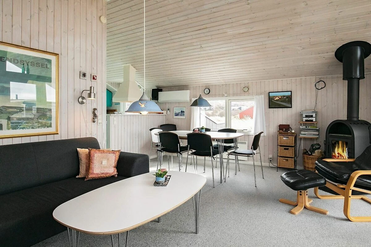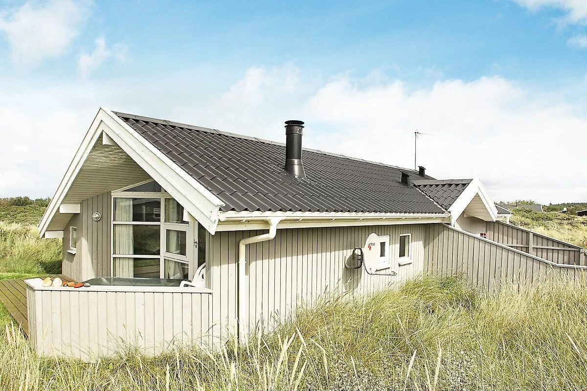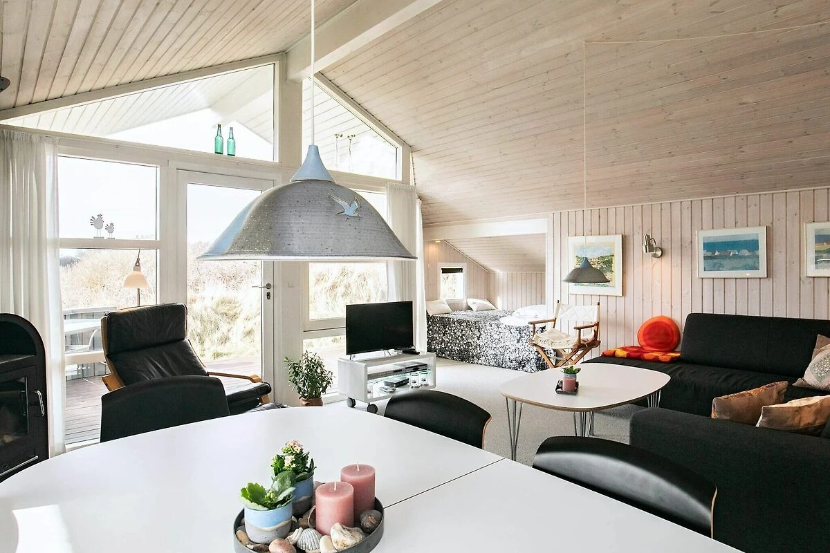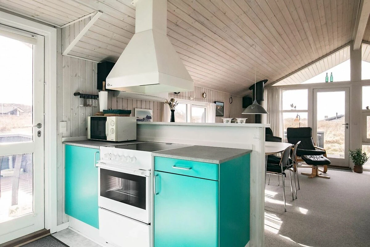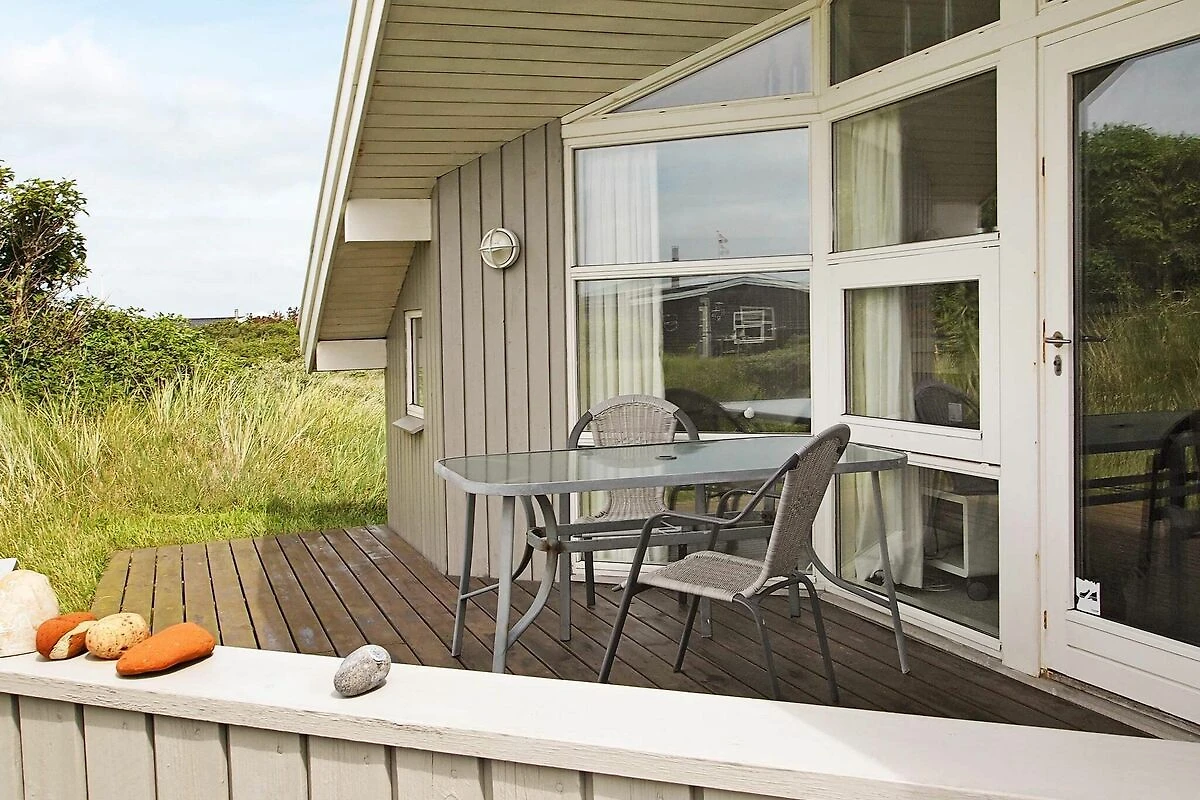 Ca. A 100 m dal mare su un grande appezzamento di dune leggermente collinare si trova questo cottage ben tenuto. Da un paio di finestre del soggiorno si intravede appena il mare mentre da un punto alto del lotto si ha una buona vista mare. Soggiorno in collegamento aperto con la cucina, due camere da letto, alcova e bagno con doccia e riscaldamento a pavimento. L'arredamento è di buon gusto e moderno in stile cottage danese e con l'accento principale sul benessere, l'intimità e l'intimità. Per il riscaldamento economico e l'intimità c'è una stufa a legna. Il terrazzo scoperto a sud/ovest ha un buon riparo mentre il terrazzo esposto a est/sud è coperto. La trama è aperta, leggermente collinare e si affaccia sul mare da un punto alto.