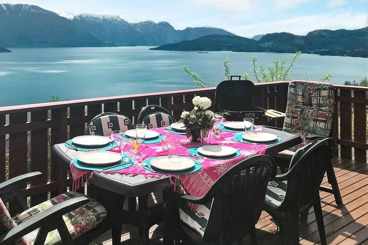 Vista mozzafiato sul Hardangerfjord dalla grande terrazza, perfetta per serate barbecue e relax,
