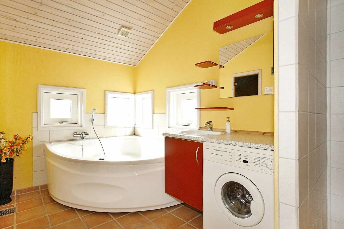 , Salotto(brandina doppia), Angolo cottura(mobile cucina(elettrico), cappa aspirante, caffettiera, forno a microonde, lavastoviglie, frigo con congelatore, asciugabiancheria, lavatrice), Soggiorno/camera da letto(TV(satellite, canali televisivi tedeschi, canali TV danesi), lettore DVD, impianto stereo, seggiolone), Camera da letto(letto matrimoniale, lettino con sponde), Camera da letto(letto matrimoniale), Camera da letto(letto matrimoniale), Camera da letto(2x letto singolo), Bagno(sotto pavimento)(vasca o doccia, lavabo, WC), Bagno(sotto pavimento)(vasca o doccia, lavabo, WC), vasca idromassaggio(all’interno, riscaldata), sauna(all’interno, riscaldata), riscaldamento(elettrico), terrazza, giochi per bambini, termopompa aria-aria