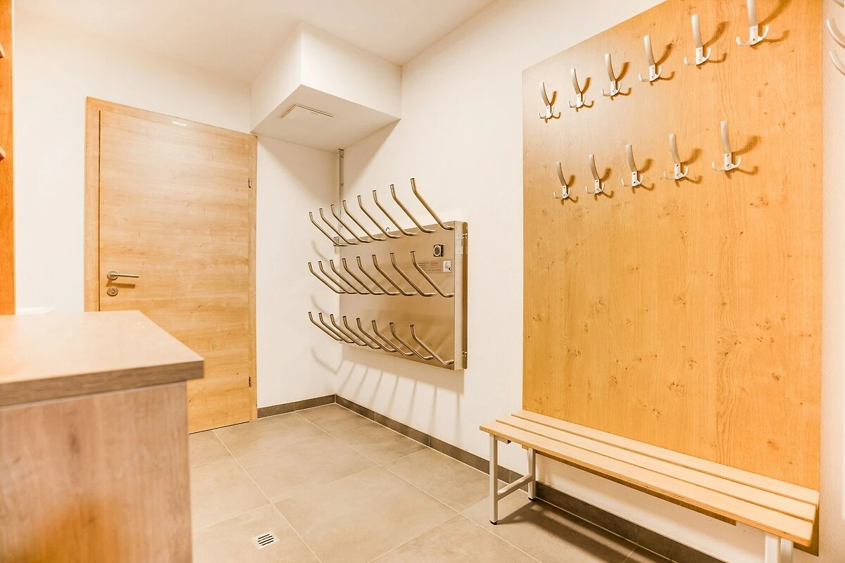 Seminterrato: (Camera da letto(letto matrimoniale(boxspring), TV), Bagno(doccia, lavandino, WC), Stanza bagni / spogliatoi(asciugabiancheria, lavatrice, asse da stiro), spazio relax(vasca, sauna, lettini prendisole), sgabuzzino(frigorifero), ripostiglio per sci(riscaldatori per scarpe da sci), deposito biciclette)