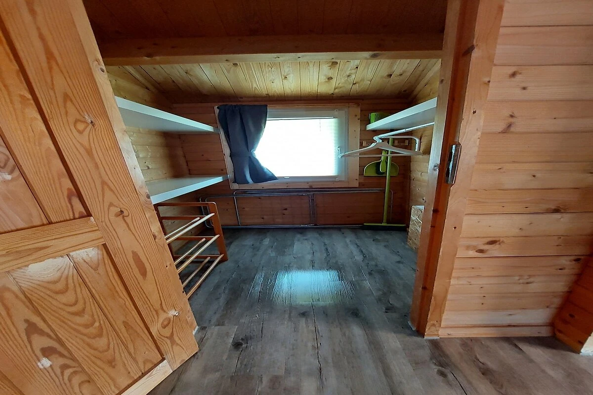 Pianterreno: (Angolo cottura(bollitore, tostapane, mobile cucina(4 fuochi, ceramica), caffettiera, forno), Soggiorno/camera da letto(letto matrimoniale, TV(schermo piatto), salottino), Bagno(doccia, lavandino, WC), Soppalco aperto(attraverso scala ripida)(box letto per 2-pers.), sgabuzzino)