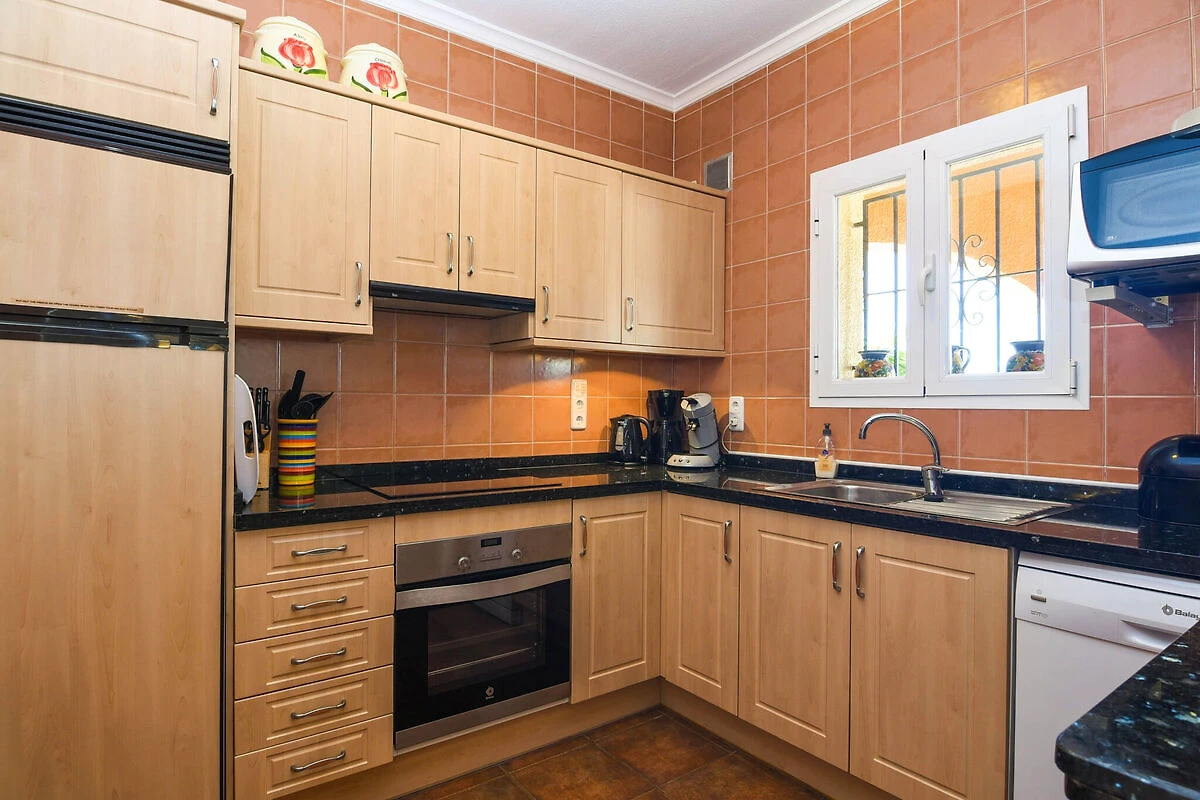 La casa principale dispone di una cucina completamente attrezzata con elettrodomestici moderni, un accogliente soggiorno/sala da pranzo con smart TV e stufa a legna e due camere da letto climatizzate con letti singoli. Due bagni, uno con cabina doccia e l'altro con vasca, aggiungono comfort. La dependance comprende un'ulteriore camera da letto con bagno privato e terrazza privata. All'esterno, potrete godere di un giardino recintato, lettini prendisole, barbecue e una piscina privata di 7x3 m, ideale per rilassarsi sotto il sole della Costa Blanca.