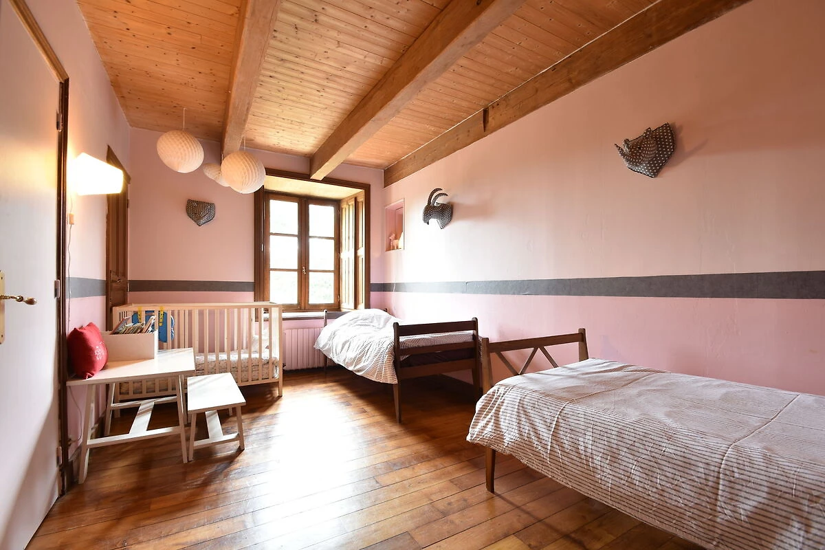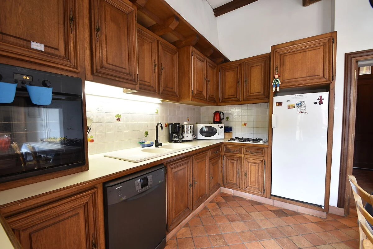 Interni, l'ampia disposizione comprende diverse zone giorno con camino, un'ampia sala da pranzo con 18 posti a sedere e una cucina completamente attrezzata con elettrodomestici moderni. Le camere da letto sono distribuite su tre piani, con un mix di letti matrimoniali, singoli e a castello, oltre a diversi bagni con doccia e vasca. Gli ospiti possono godersi serate accoglienti accanto al fuoco o pomeriggi soleggiati rilassandosi in giardino. La biancheria da letto è disponibile al costo di 15 € a persona e la legna per il camino può essere procurata in loco.