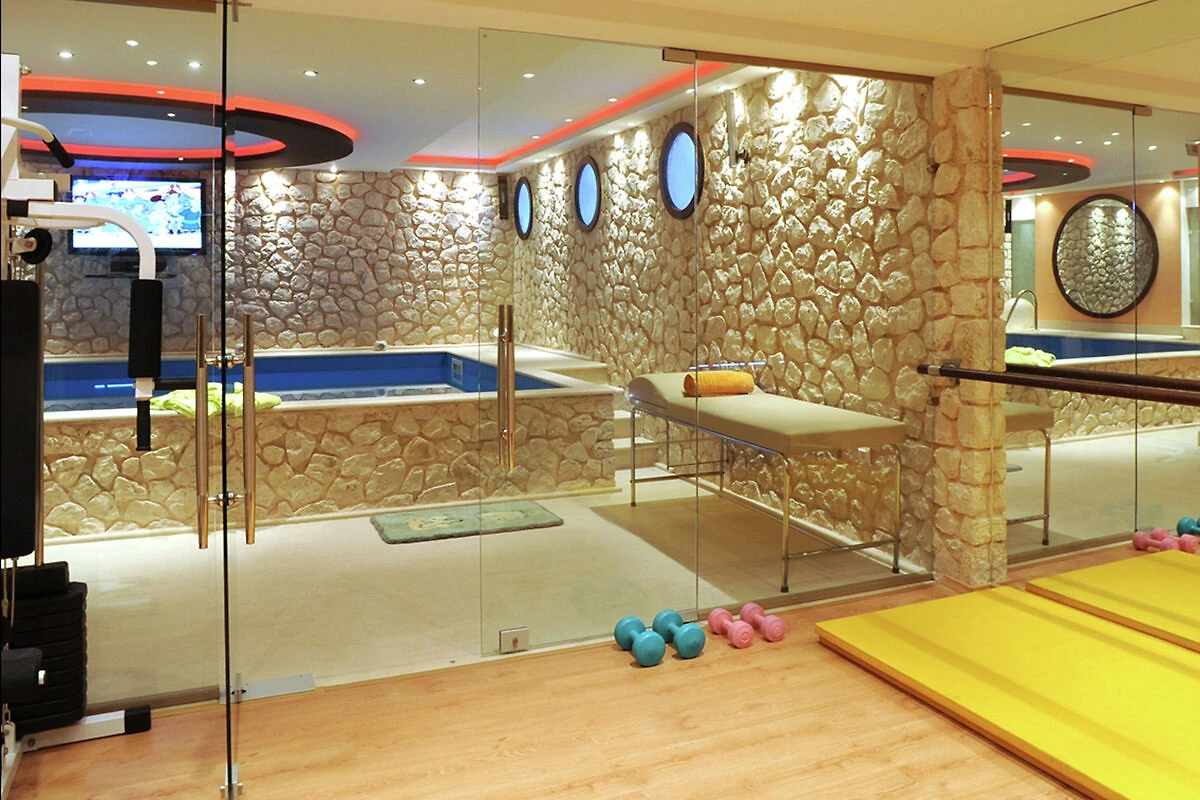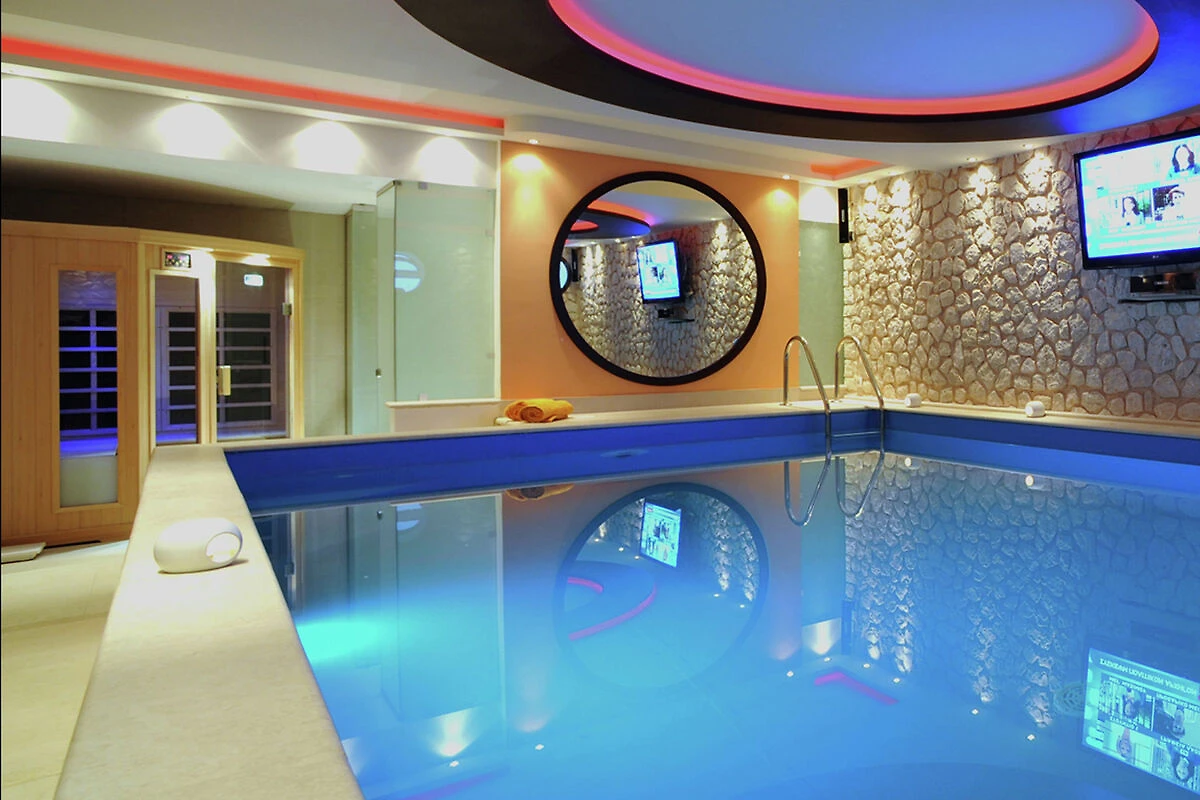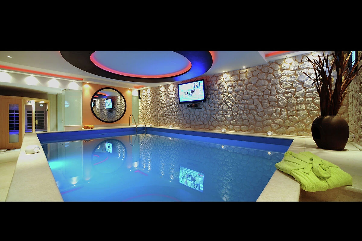 Pianterreno: (Bagno(radio, lettore CD, doccia massaggio), stanza fitness(attrezzi da fitness), sauna(radio, lettore CD, sauna a infrarossi), impianto audio wireless, piscina(privato, riscaldata, interna, 6 x 4 m.))