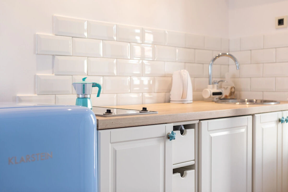 Pianterreno: (Soggiorno(TV(schermo piatto, satellite), salottino), Cucina separata(tavolo da pranzo, bollitore, tostapane, mobile cucina, caffettiera, frigo con congelatore), Camera da letto(letto matrimoniale), Bagno(doccia, lavandino, WC), terrazza(privato, recintato))