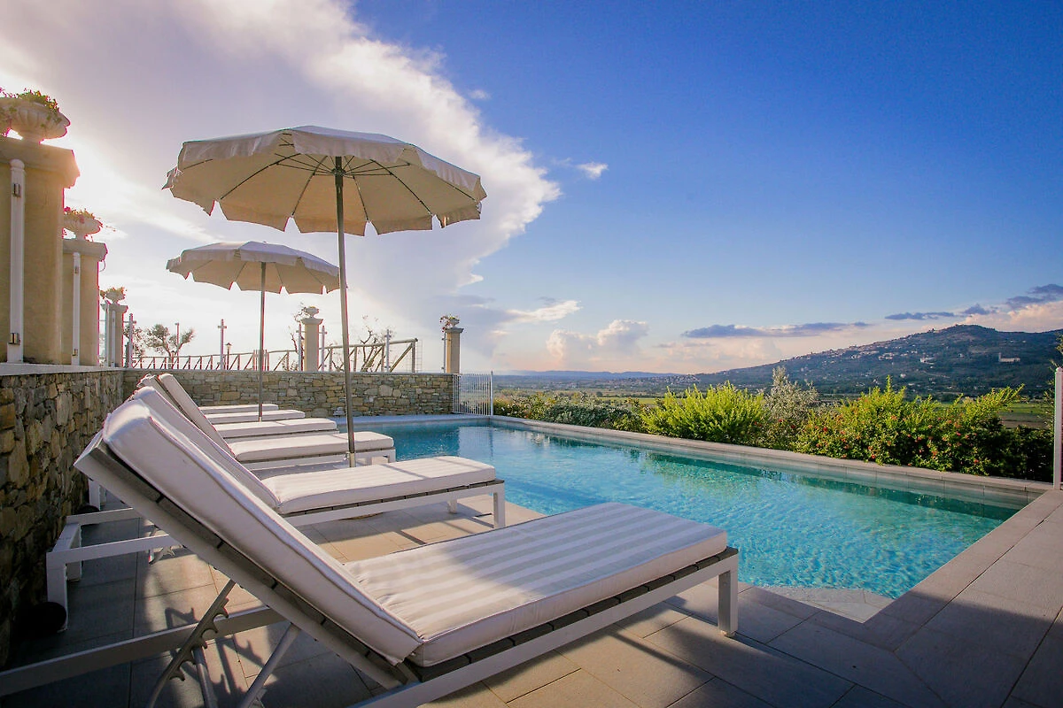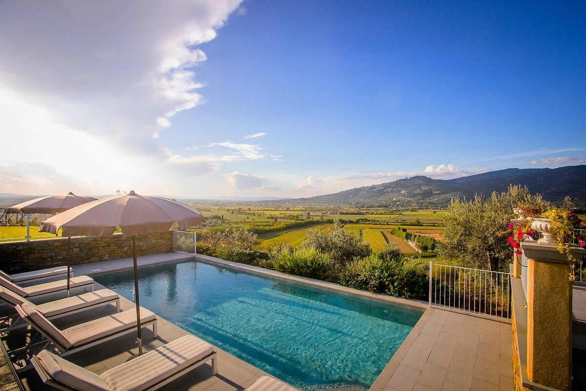 La Villa è situata in una delle colline che circondano la città etrusca di Cortona a breve distanza dalla città e tuttavia in un luogo appartato e tranquillo da cui si gode di una vista incomparabile sulla Valdichiana e su Cortona.