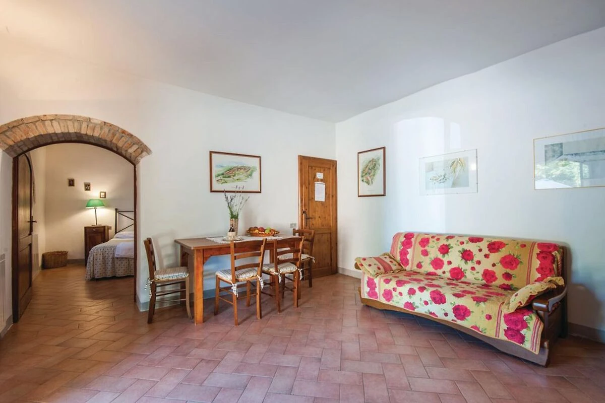 Internamente, il casale offre un'accogliente zona giorno con divano letto matrimoniale, una cucina ben attrezzata e una camera da letto dal fascino rustico. Godetevi la vista mozzafiato sul paesaggio toscano dalle vostre finestre e approfittate della lavatrice per una maggiore comodità. È disponibile una culla per i più piccoli e un animale domestico è il benvenuto gratuitamente.