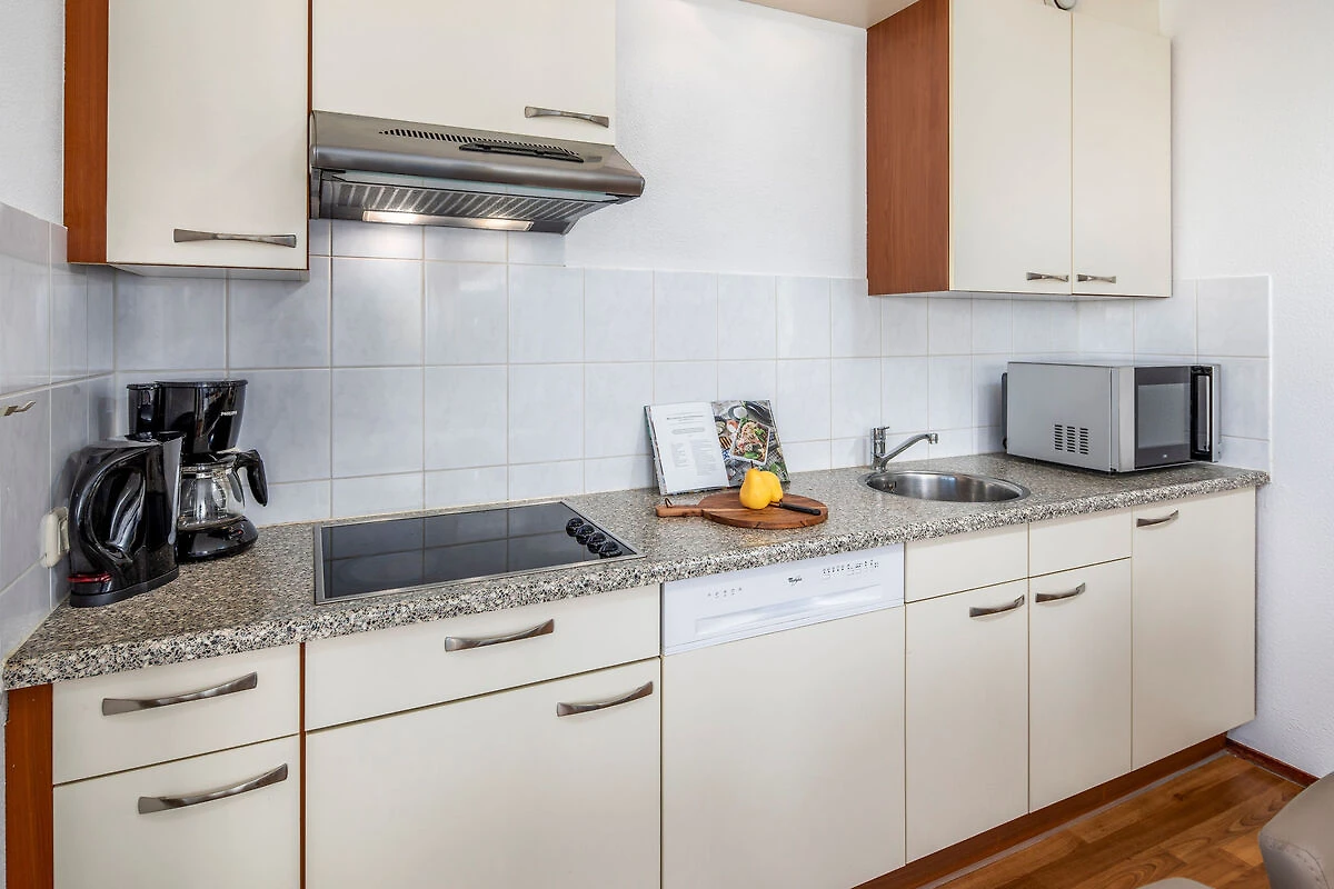 Pianterreno: (Atrio(WC), Soggiorno(TV(smart TV)), Angolo cottura(bollitore, caffettiera(per caffé americano), forno a microonde, lavastoviglie, frigo con congelatore))