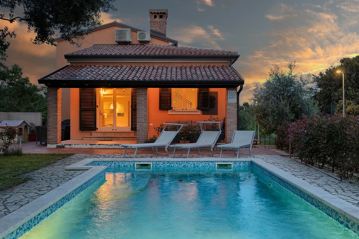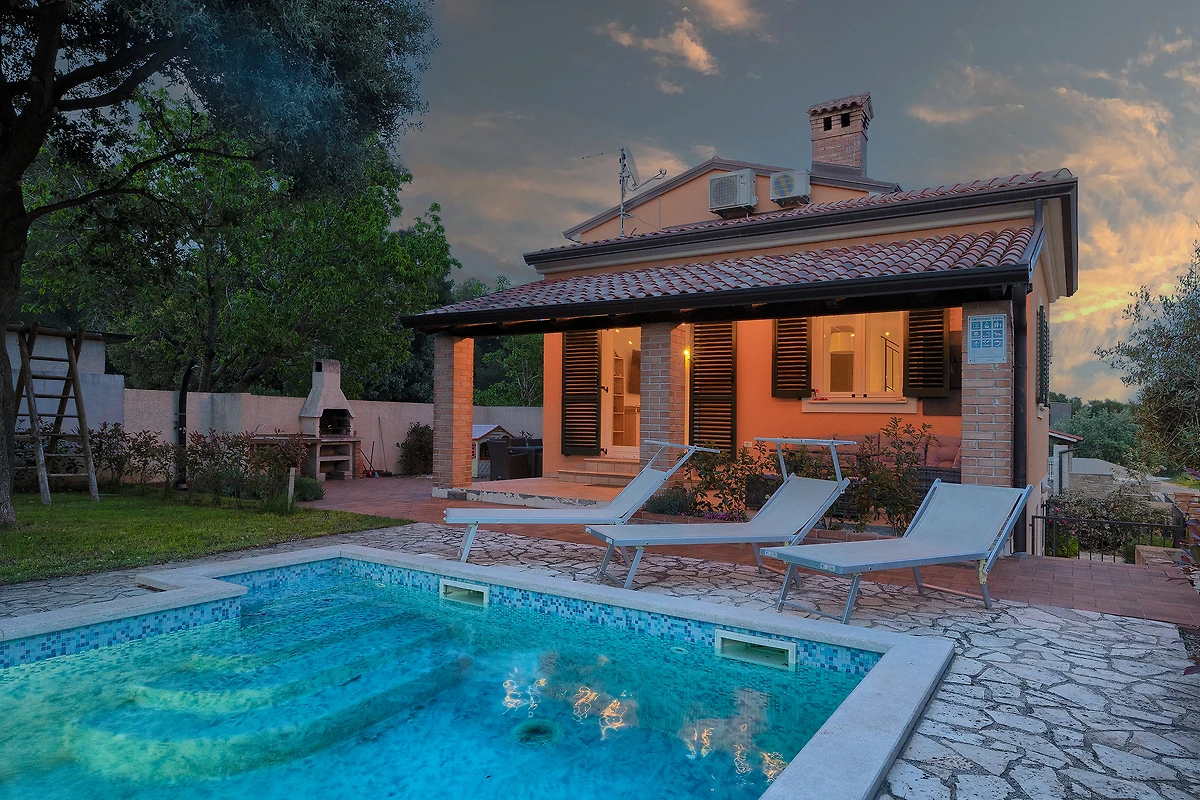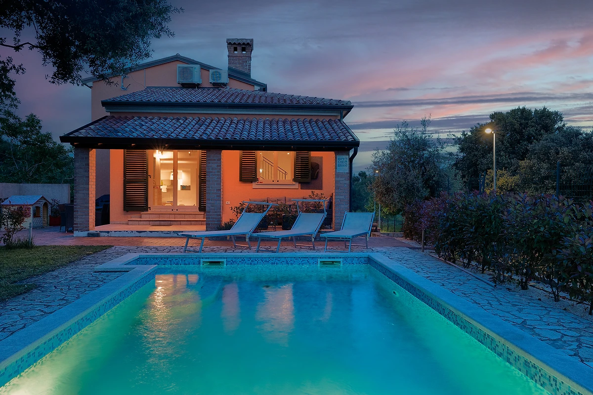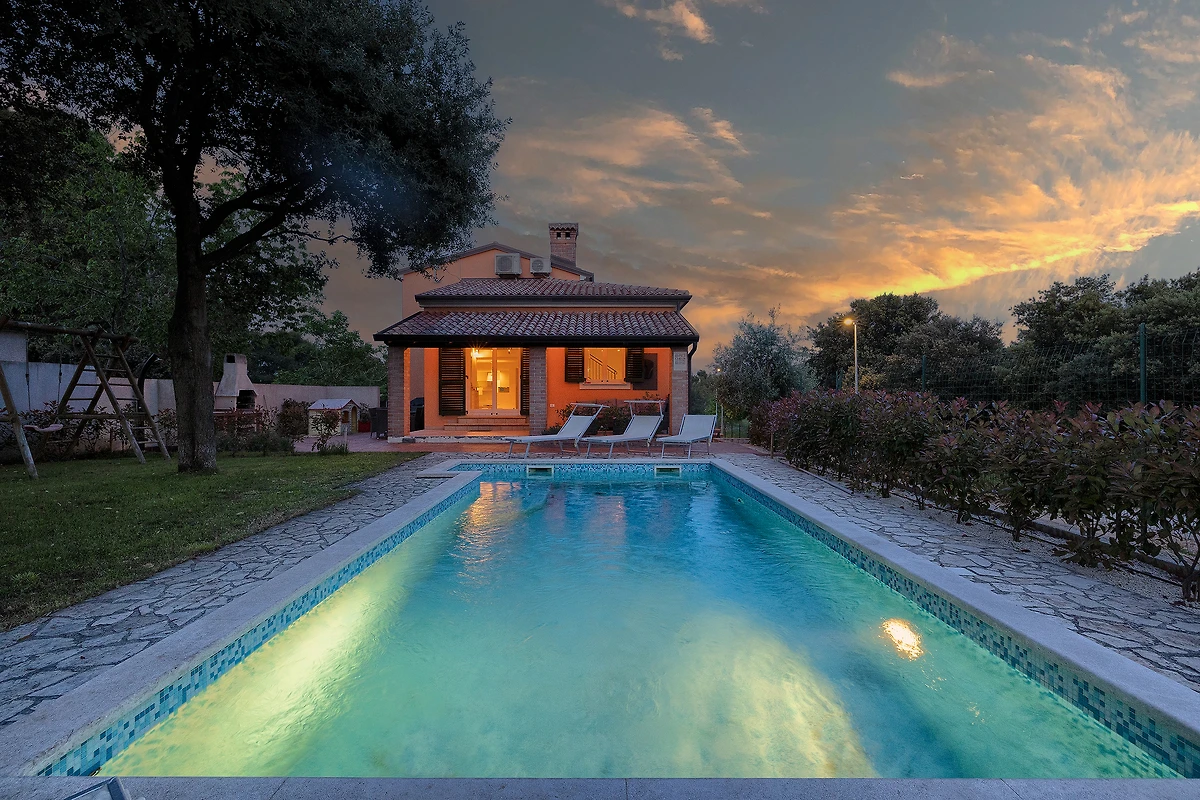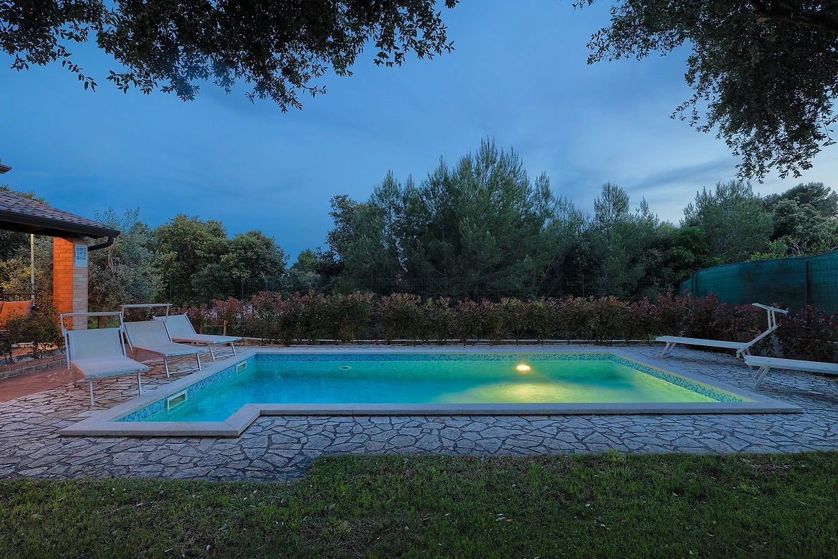 Una bellissima villa con piscina privata si trova in uno dei luoghi turistici più famosi dell'Istria - Medulin. La villa si trova in una strada tranquilla. Questo bellissimo alloggio può ospitare fino a 8 persone e dista solo 1 km dal mare. Puoi anche raggiungere a piedi un ristorante (900 m) e un negozio (950 m). La villa si estende su 650 mq, di cui 130 mq di abitazione. Nel giardino privato si trova una piscina di 35 mq con doccia esterna. Ping-pong, parco giochi per bambini, barbecue con mobili da giardino e un tavolo all'aperto dove mangiare tutti insieme. L'intera casa è climatizzata e dispone di una connessione Wi-Fi gratuita. La villa offre 4 belle e accoglienti camere da letto con 2 bagni. La villa può ospitare fino a 8 persone in 4 camere da letto. La villa offre una vacanza molto tranquilla.