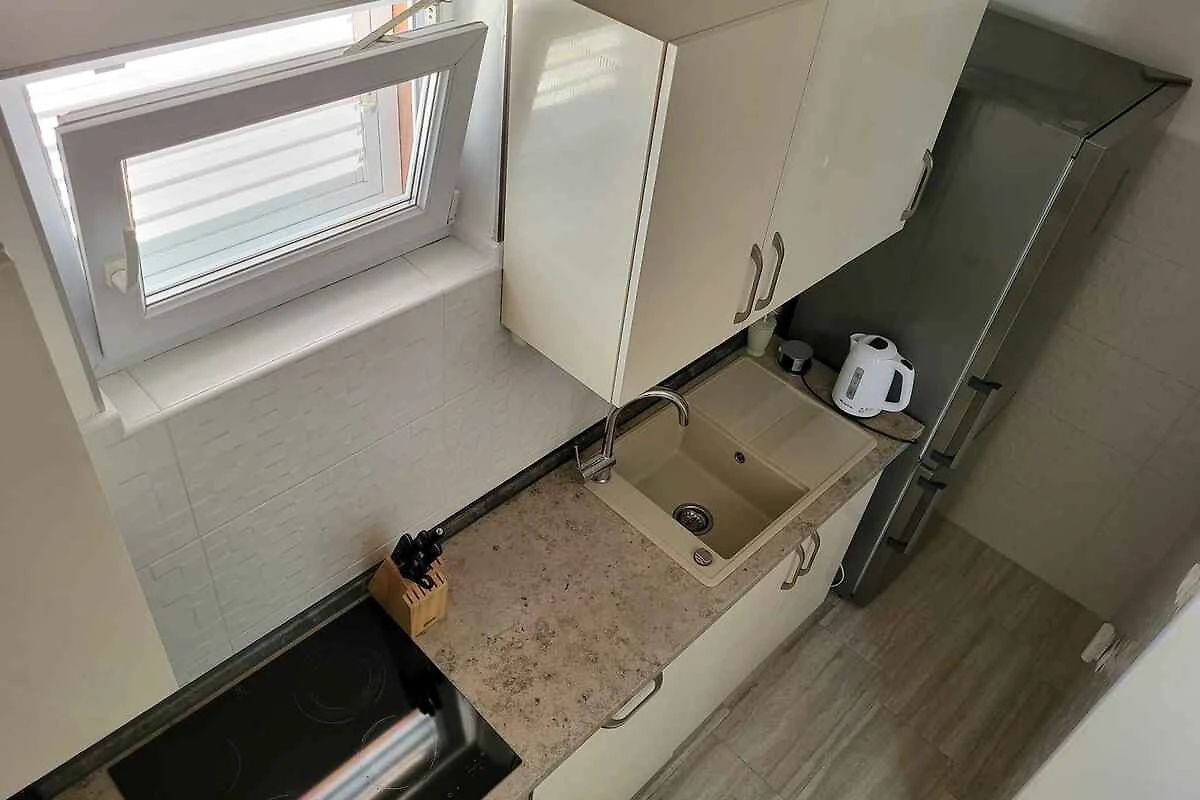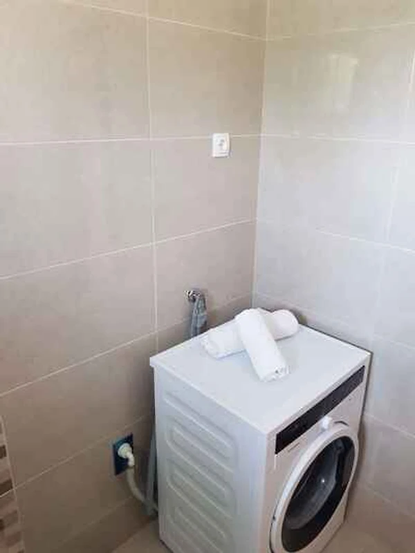 e conduce tramite una scala esterna e il balcone di 14 mq direttamente nel corridoio con guardaroba e porte per tutte le stanze. Soggiorno con 2 posti letto aggiuntivi su divano letto doppio estraibile, salottino, TV, zona pranzo (6 posti) e accesso alla terrazza. 2 camere da letto ciascuna con 1 letto matrimoniale. Camera da letto con 1 letto matrimoniale e accesso alla terrazza. Cucina nel soggiorno (14 mq) con TV, zona pranzo (6 posti), piano cottura a gas (2 fuochi), piano cottura elettrico (2 piastre), forno, cappa aspirante, lavastoviglie, frigorifero (scomparto freezer), macchina da caffè, tostapane, bollitore elettrico, lavatrice, asciugatrice e accesso alla terrazza. Bagno (9 mq) con vasca da bagno con dispositivo per doccia, lavatrice, asciugatrice, doccia, 1 lavabo, WC e finestra.