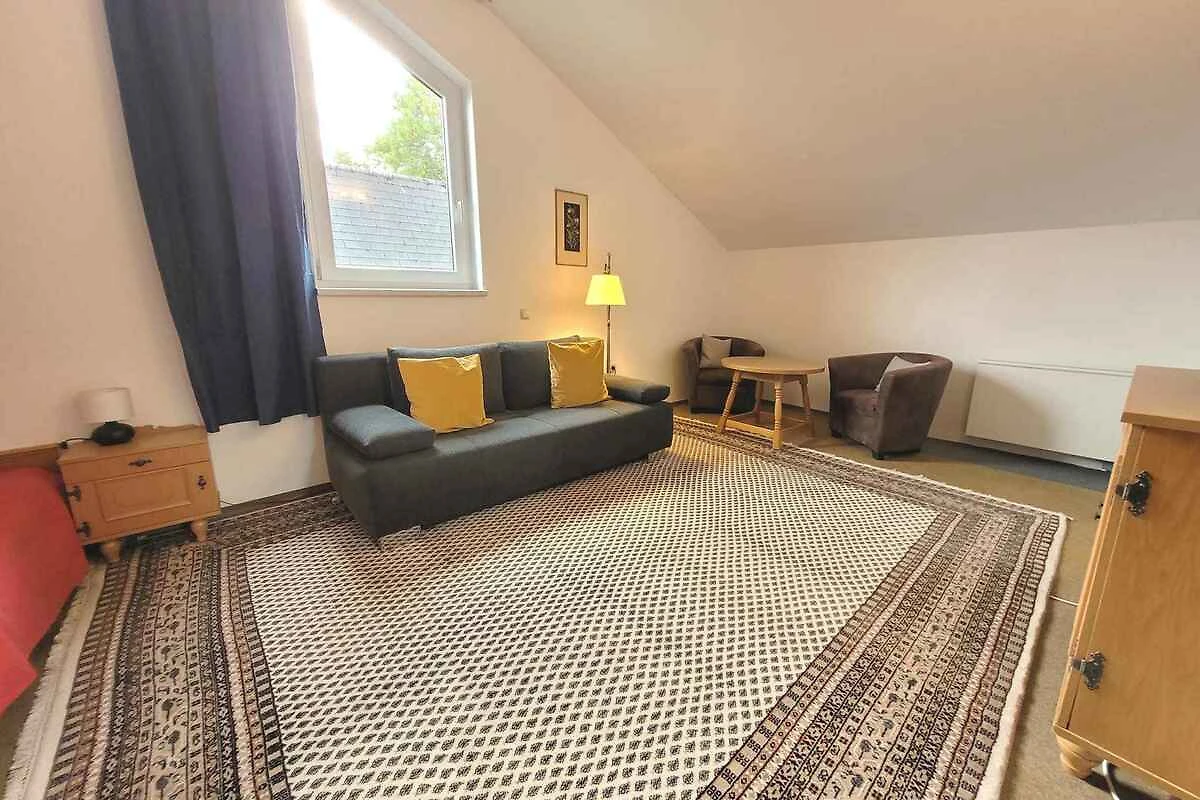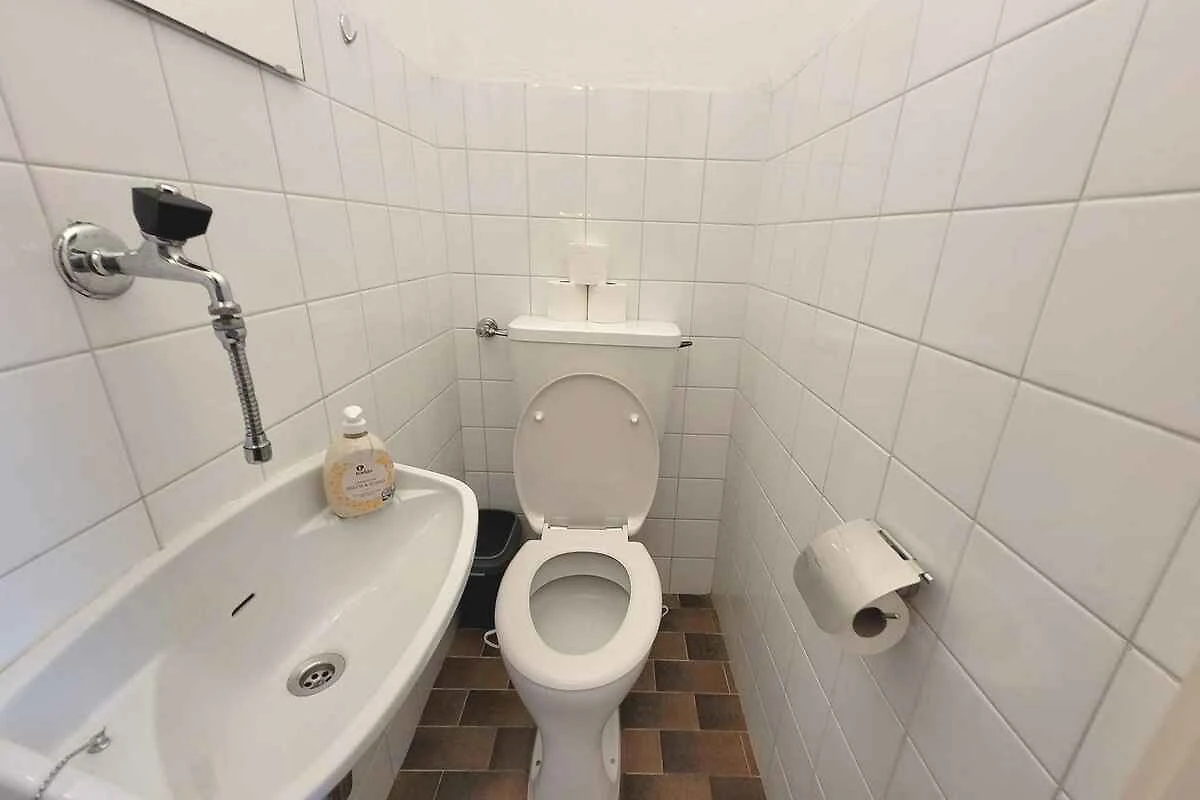 Piano terra: Soggiorno (20 mq, camera di passaggio) con angolo di seduta, TV, camino, radio, CD, zona pranzo (6 posti), accesso alla terrazza (coperto, mobili da giardino, 1 tavolo, 4 sedie) e Purtroppo il camino non può essere utilizzato. Camera da letto (15 mq) con 1 letto matrimoniale e accesso alla terrazza (coperto, mobili da giardino). Cucina (5 mq) con fornello elettrico (4 fornelli), forno, frigorifero (scomparto del ghiaccio), microonde, caffettiera, tostapane e bollitore elettrico. Atrio (3 mq). Bagno (5 mq) con vasca da bagno con dispositivo doccia, 2 lavandino, bidet, asciugacapelli e finestra. WC separato (2 mq, non riscaldabile) con WC.