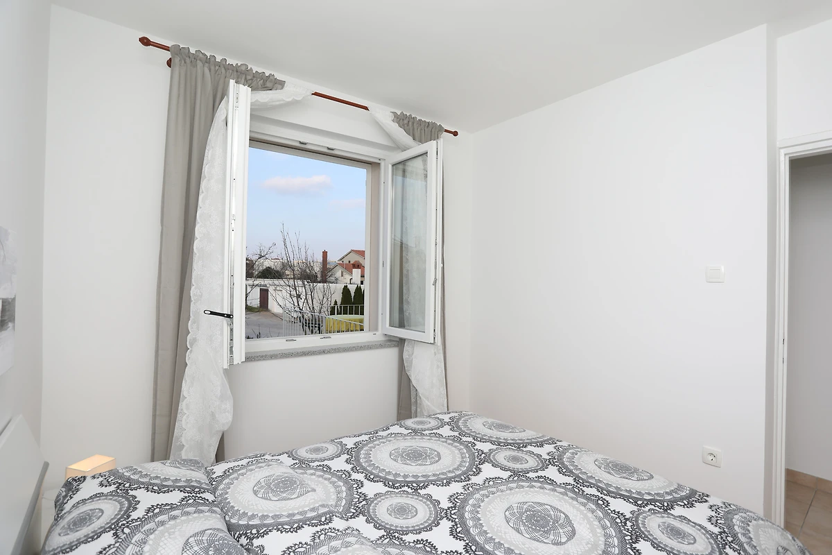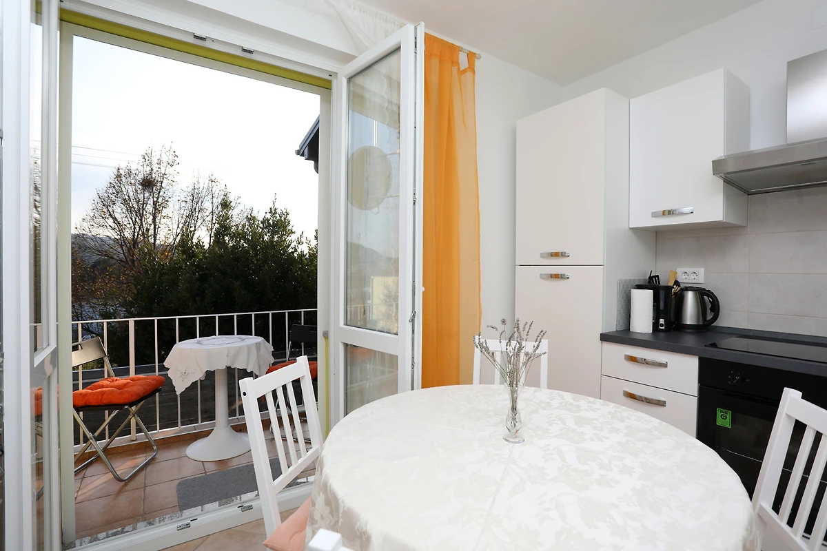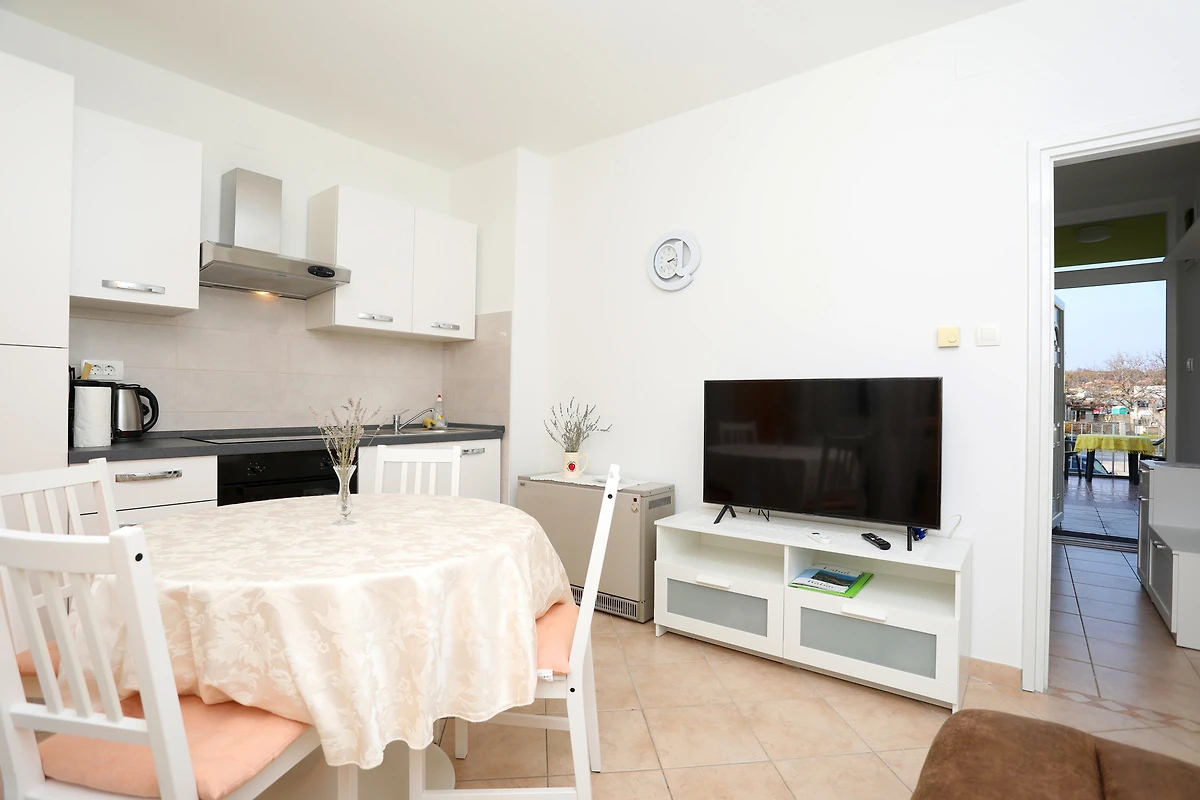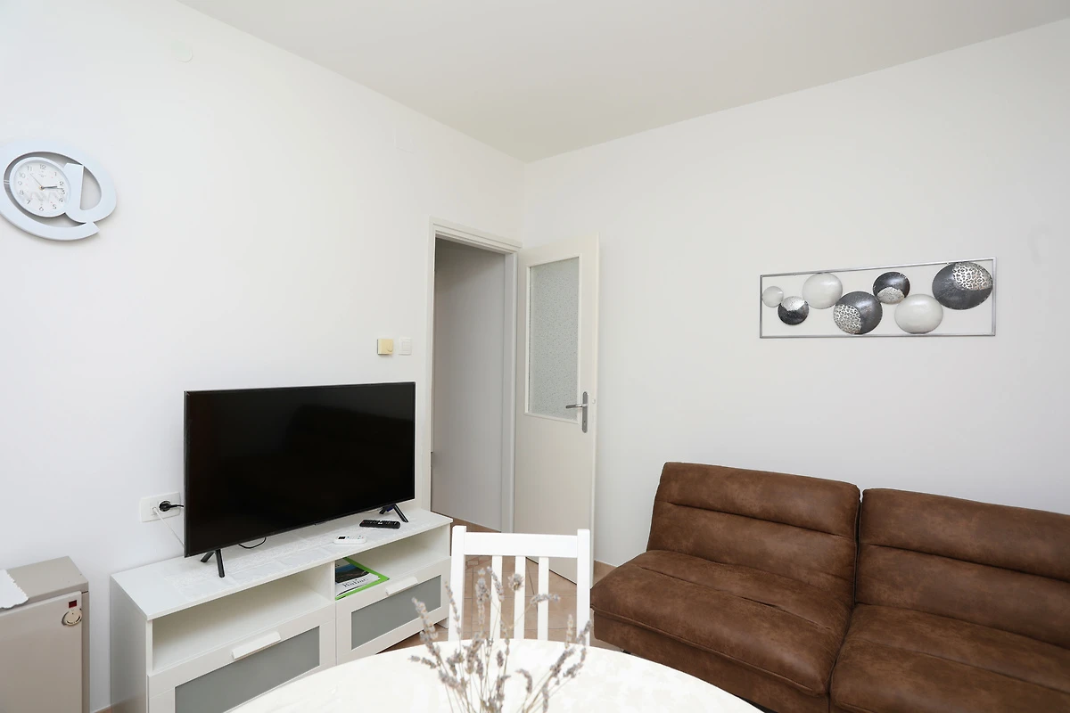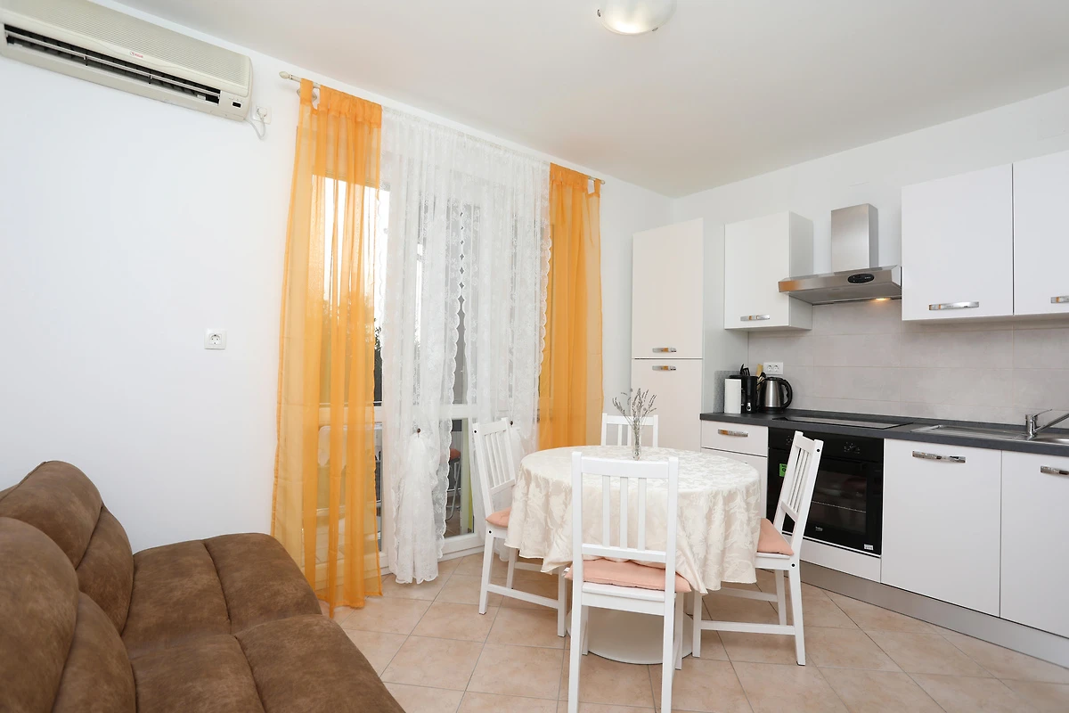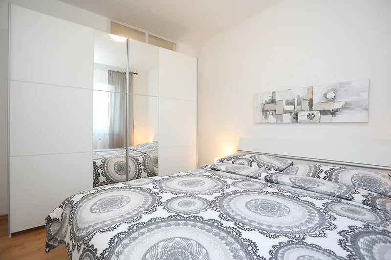 e conduce sopra la terrazza é 10 mq grande e il balcone 4 mq grande direttamente nel vestibolo. Cucina soggiorno con 1 letto matrimoniale, TV, zona pranzo e accesso al balcone. Camera da letto. Cucina con TV, zona pranzo, fornello elettrico (piano cottura ceran, 4 fornelli), forno, cappa aspirante, lavastoviglie, frigorifero (scomparto del ghiaccio), caffettiera, tostapane, bollitore elettrico, lavatrice e accesso al balcone. Bagno con lavatrice, doccia, 1 lavandino, WC e asciugacapelli.