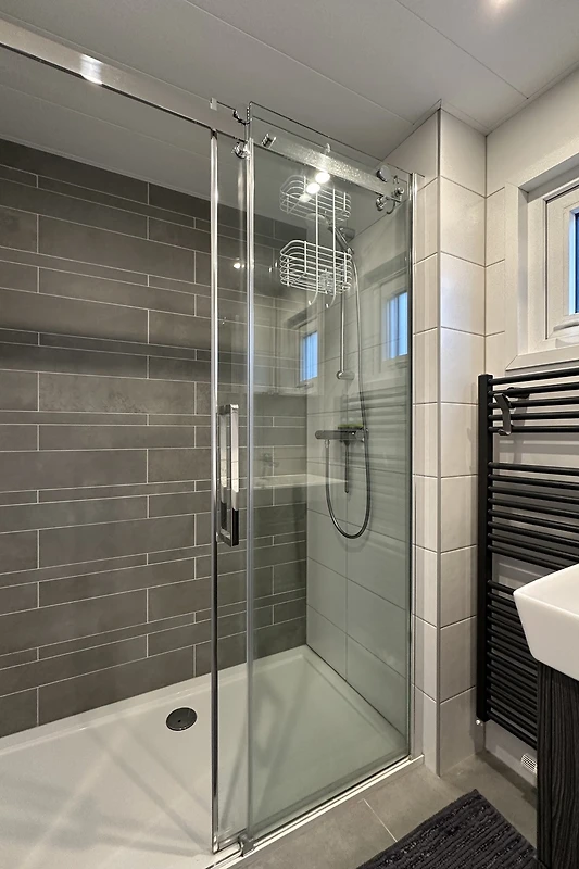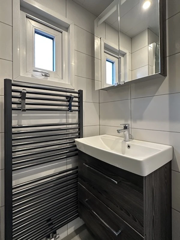 Il bagno dispone di una lussuosa doccia a filo pavimento, un lavabo con specchio e un termoarredo.