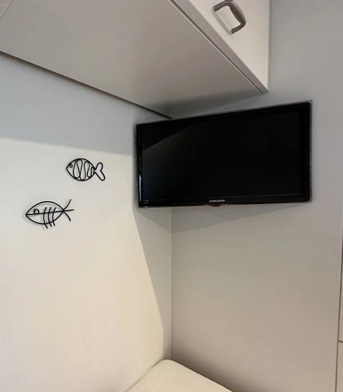Nel soggiorno ci sono un divano e un tavolo da pranzo con quattro sedie. Una televisione è presente di serie.