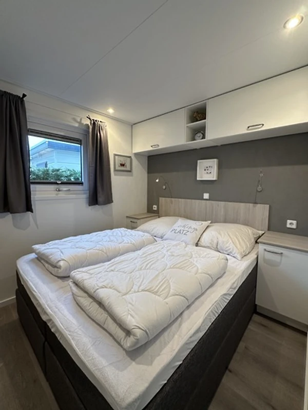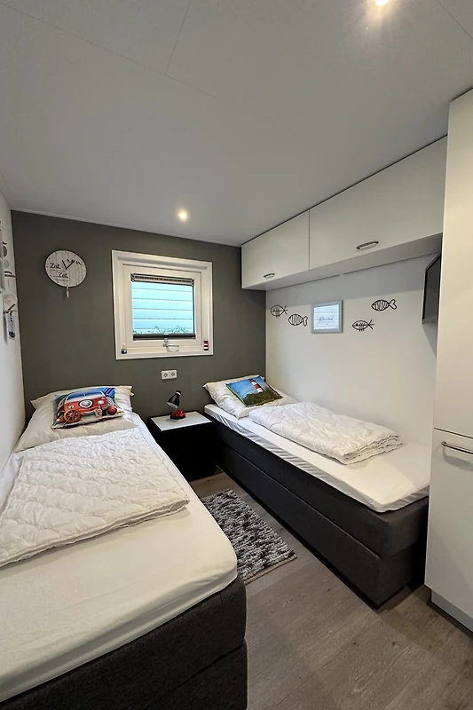 1 camera da letto con un letto matrimoniale boxspring. 1 camera da letto con due letti singoli. Tutti i letti sono dotati di piumoni singoli e cuscini.