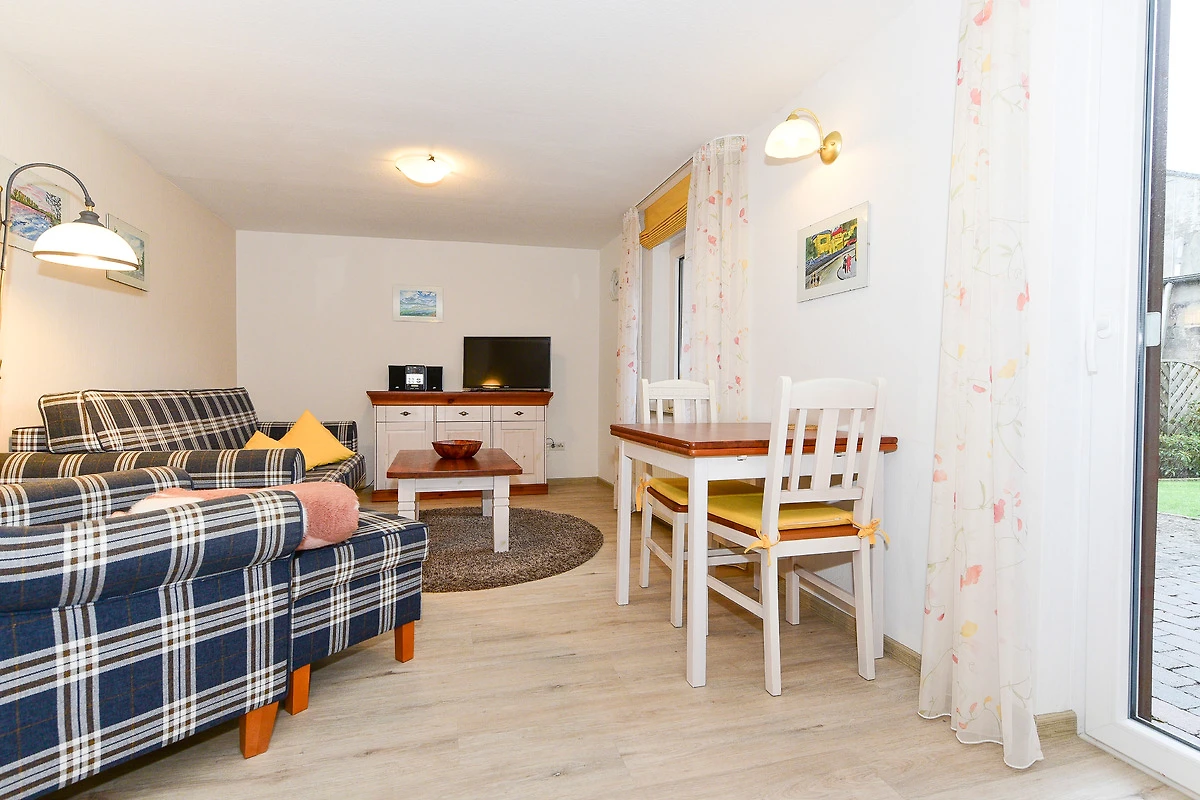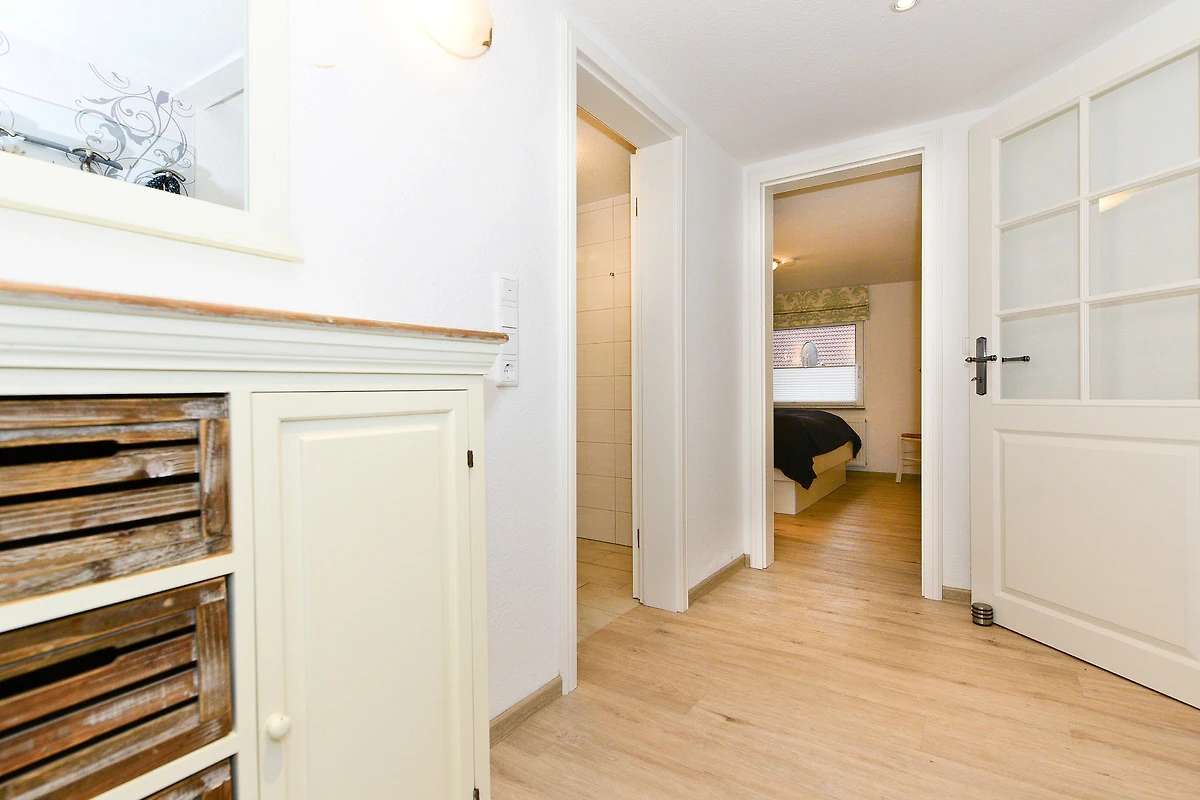 piccolo giardino carino con piante belle e lettini da spiaggia. bella posizione storica vicino a wyk città. tutto molto ben pensato - dalla lavanderia con possibilità di stirare, superficie di lavoro ergonomica, lavatrice e asciugatrice fino all'aspirapolvere con attacco per parquet, che è davvero molto piacevole da usare. un bagno elegante e una piccola cucina ben progettata. wifi funzionante. i mobili imbottiti sono di alta qualità e stabili. gestione della casa vacanze molto gentile e servizio di pulizia molto cordiale. grazie.