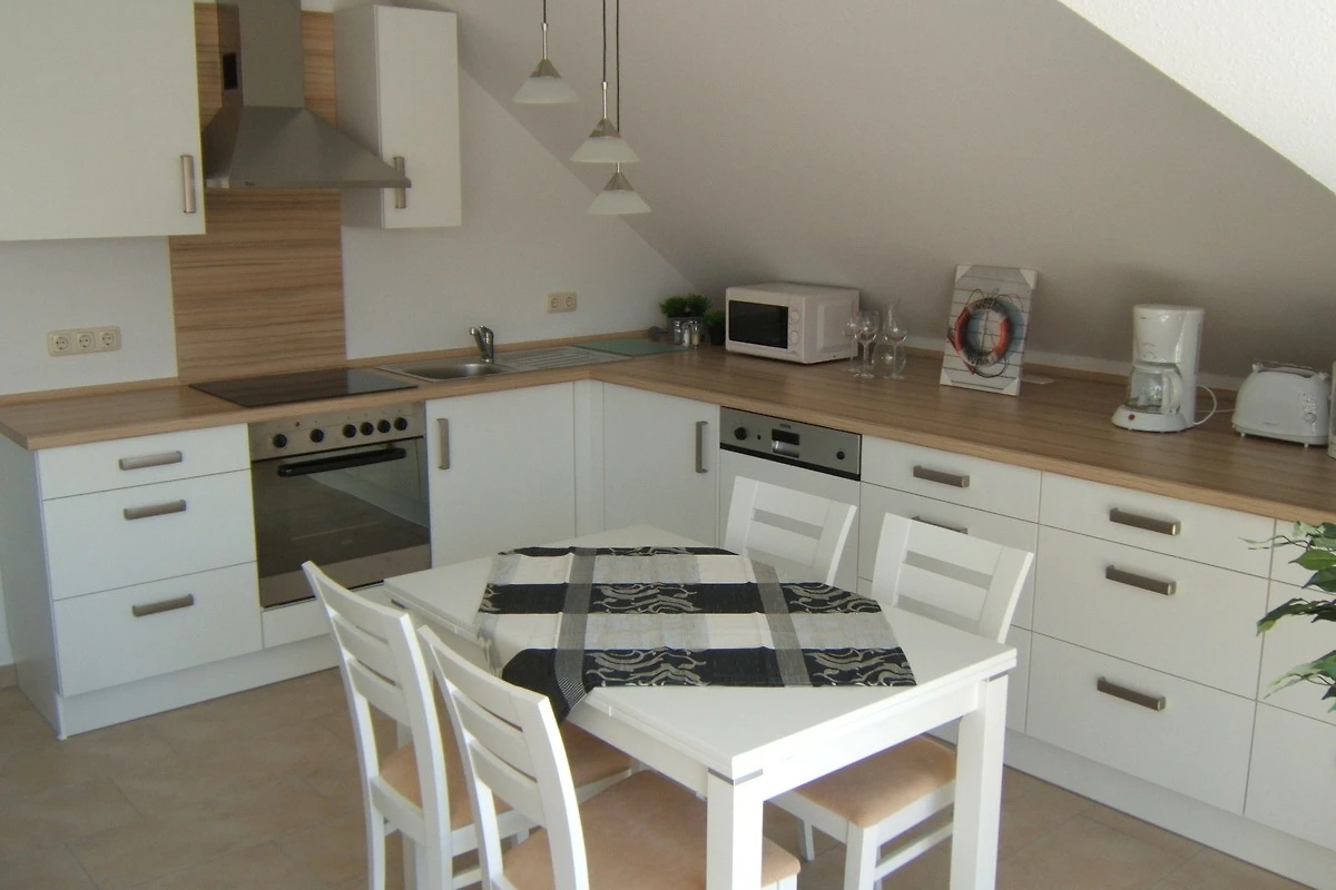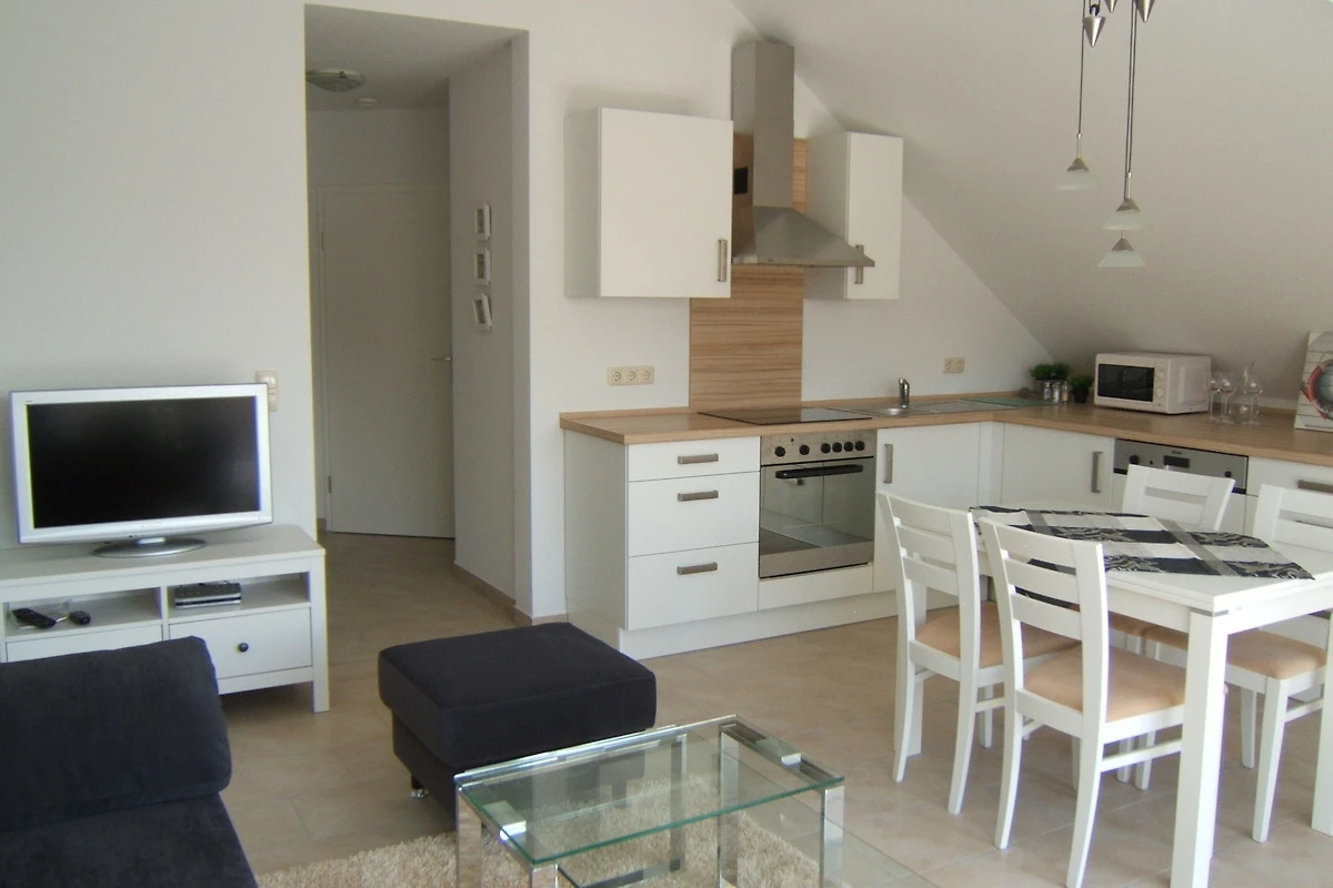 L'armadio nella camera da letto non è presente, solo un armadio a muro integrato, che si può entrare solo in posizione piegata. Wi-Fi assente, il che è praticamente standard oggigiorno. Le tende oscuranti non funzionano, a causa delle inclinazioni, perché sono troppo pesanti, quindi il fissaggio è parzialmente strappato. La camera da letto si trova direttamente sopra il panificio, che viene rifornito ogni mattina intorno alle 5:30. Con la finestra aperta, la tranquillità notturna finisce! A causa della posizione sotto il tetto, l'appartamento si riscalda nei caldi giorni estivi, il che è piuttosto sgradevole. Gli utensili per la pulizia nel frattempo potrebbero essere rinnovati, in parte non era possibile pulire.