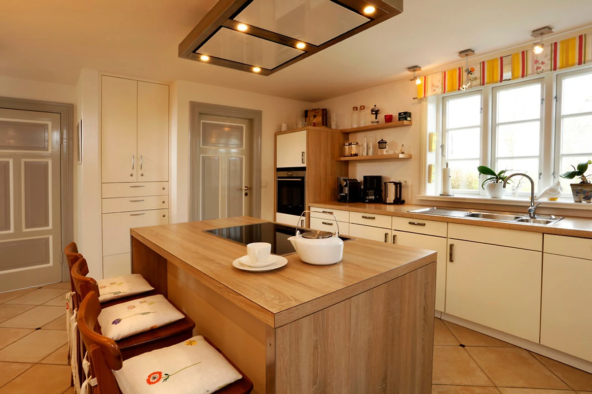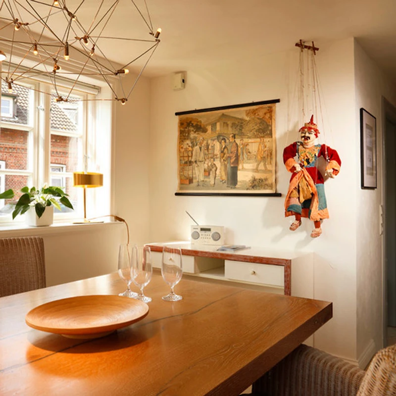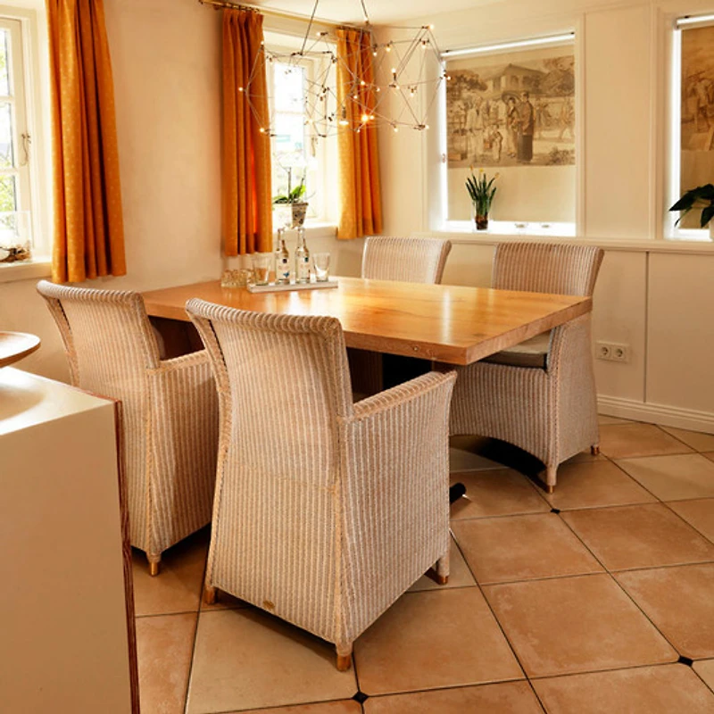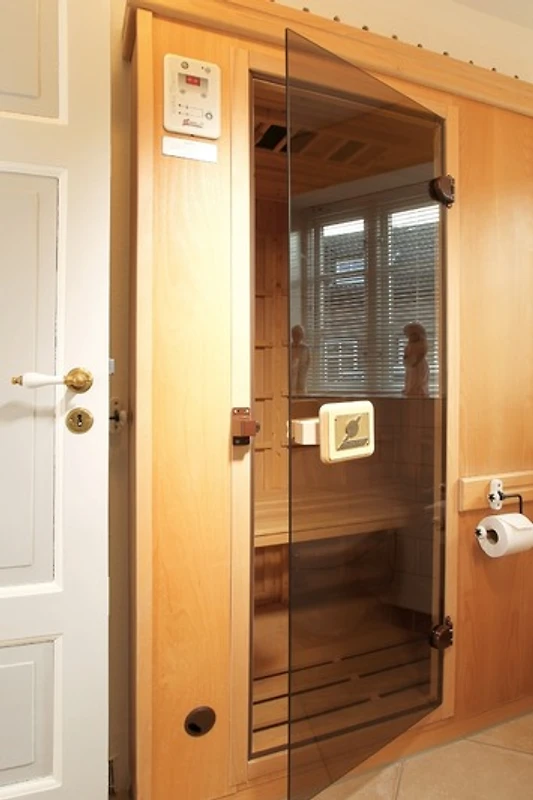 Sauna, cucina completa con isola di cottura a induzione, tutti gli elettrodomestici da cucina e da lavanderia, 2 bagni con luce naturale, giardino recintato, posizione di fronte a una buona locanda, tutto è presente. Gli svantaggi in questo ampio appartamento devono essere cercati con la lente d'ingrandimento e nessuno di essi giustifica una riduzione dei punti, ma possono essere rilevanti per alcune persone. Al piano terra, cucina, zona pranzo e soggiorno non sono a livello del suolo, ma separati da un gradino ciascuno. L'altezza utile nel 2. La camera da letto è un po' limitata a causa della pendenza del tetto.