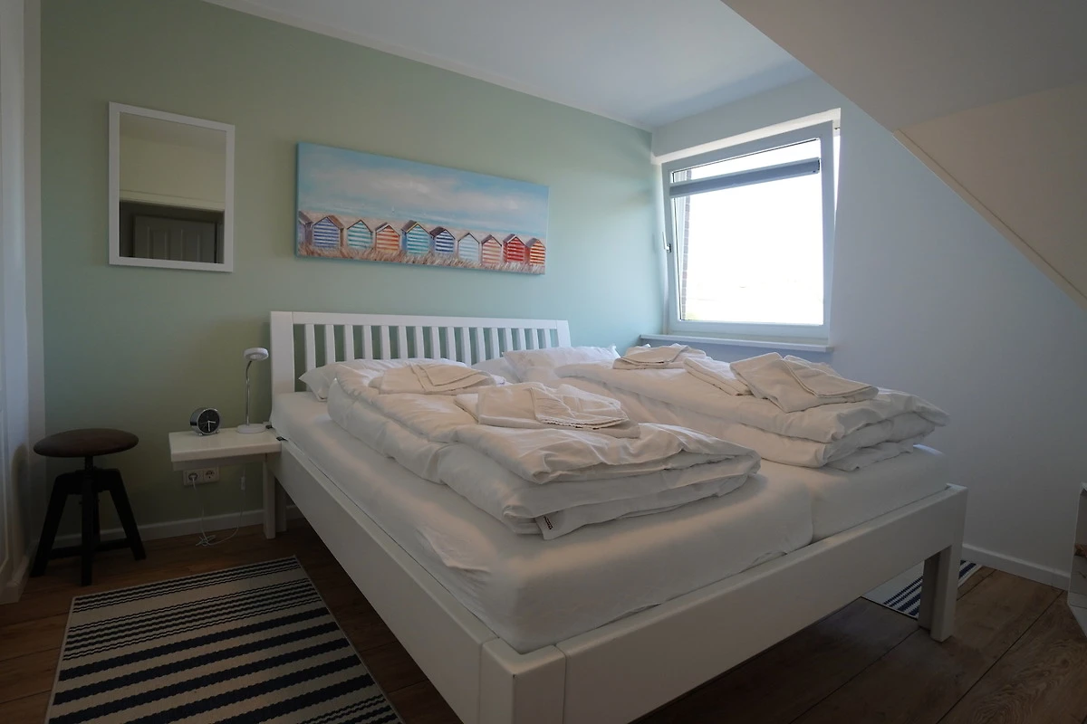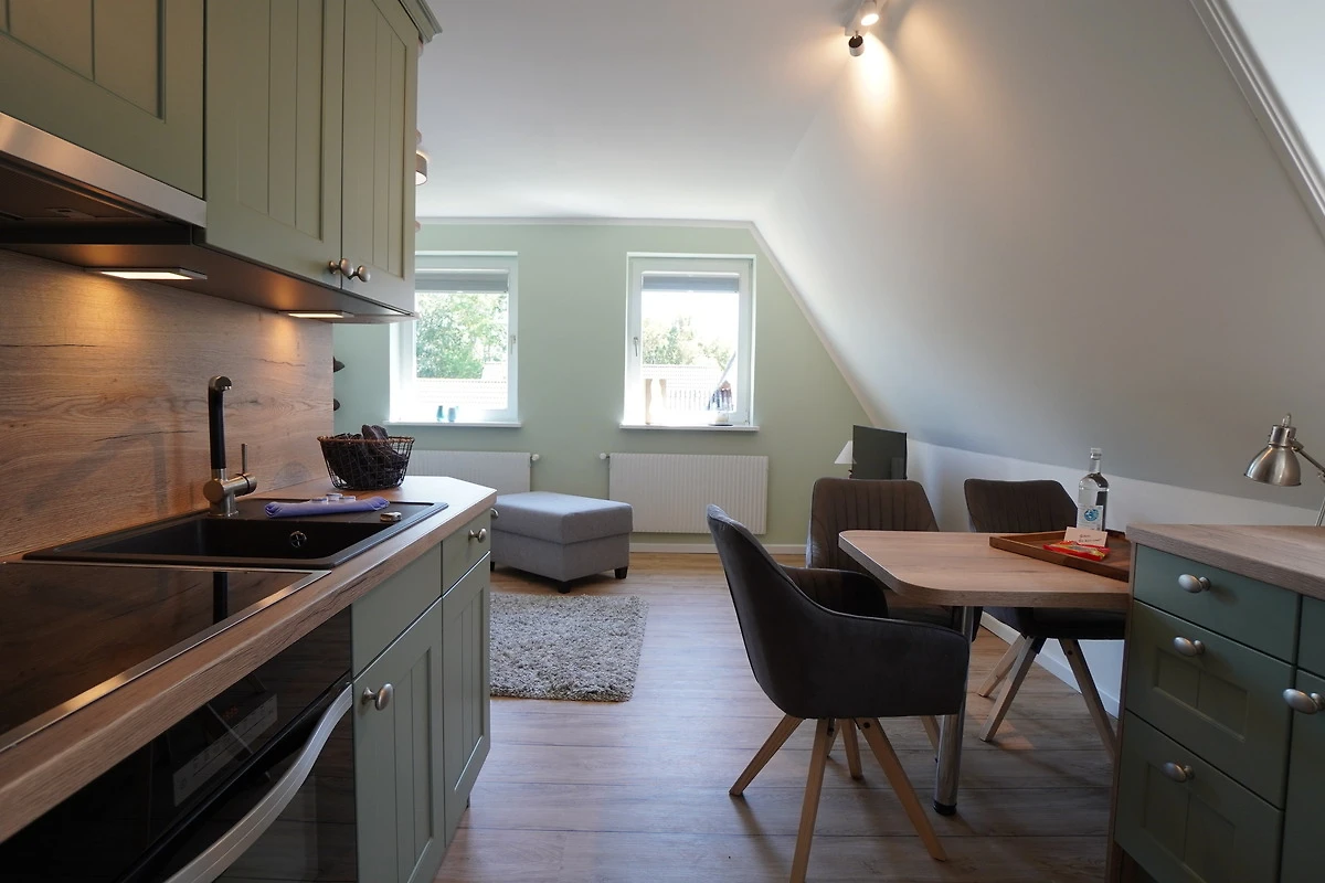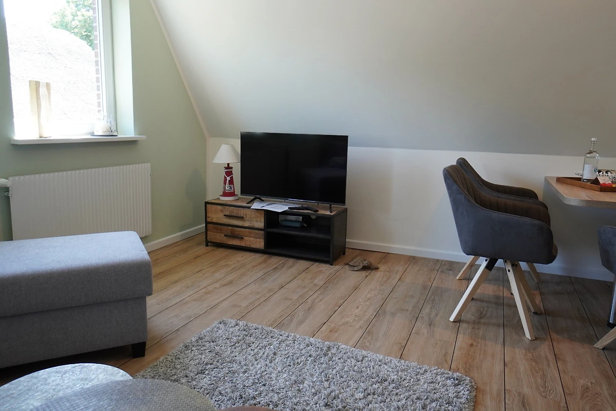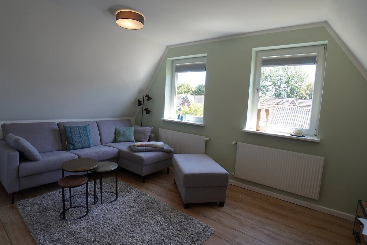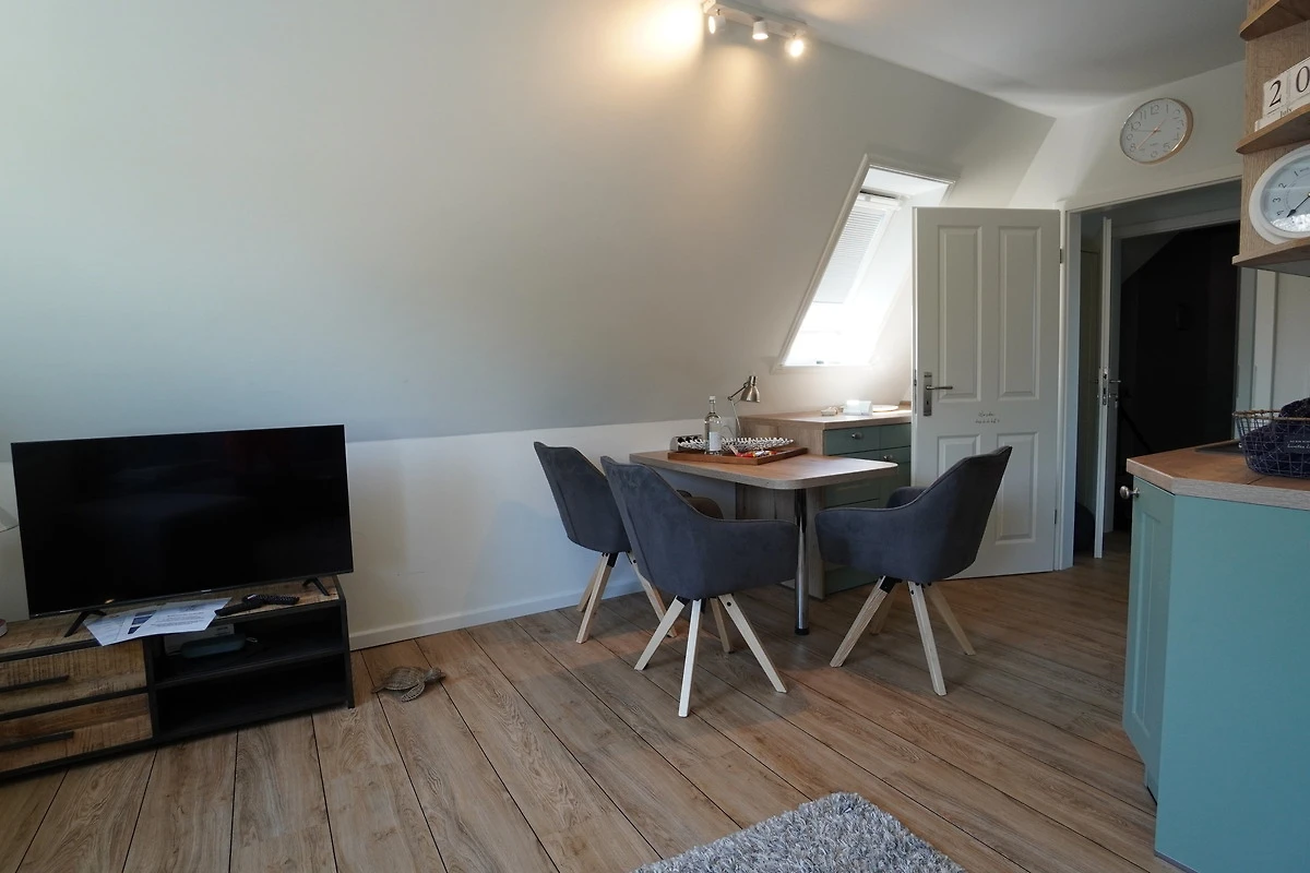 Piccola, leggermente angusta ma molto bella e pratico appartamento mansardato, posizione tranquilla nel villaggio, piccolo giardino con sedia a sdraio utilizzabile, buoni letti, tutto è facilmente raggiungibile in bicicletta.