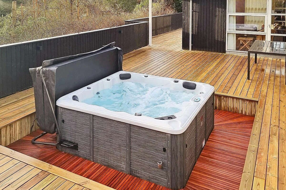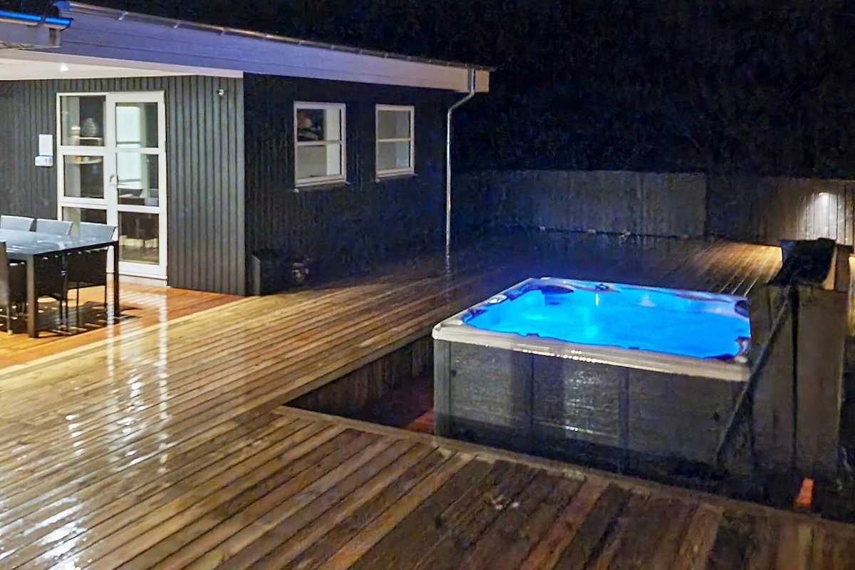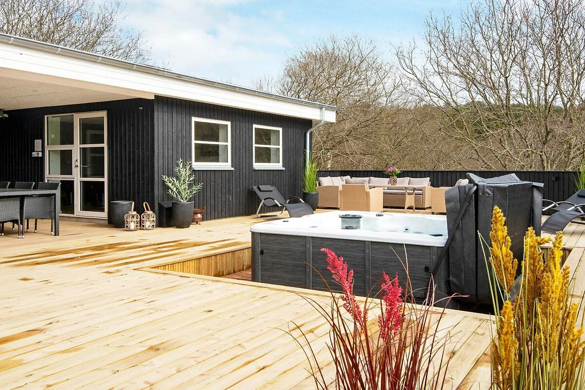 , Soggiorno(2x letto pieghevole (1 pers.)), Angolo cottura(mobile cucina(elettrico), cappa aspirante, caffettiera, forno a microonde, lavastoviglie, frigorifero(+ congelatore)), Soggiorno/camera da letto(TV(satellite, canali televisivi tedeschi, canali TV danesi)), Camera da letto(letto matrimoniale), Camera da letto(letto matrimoniale), Camera da letto(letto matrimoniale), Camera da letto(2x letto singolo), Bagno(sotto pavimento)(asciugabiancheria, vasca o doccia, lavabo, WC, lavatrice), Bagno(sotto pavimento)(vasca o doccia, lavabo, WC), vasca idromassaggio(all’interno, riscaldata, 2 persone), vasca idromassaggio(all'esterno, 6 persone), sauna(all’interno), riscaldamento(elettrico), terrazza, barbecue, freccette, biliardo, termopompa aria-aria
