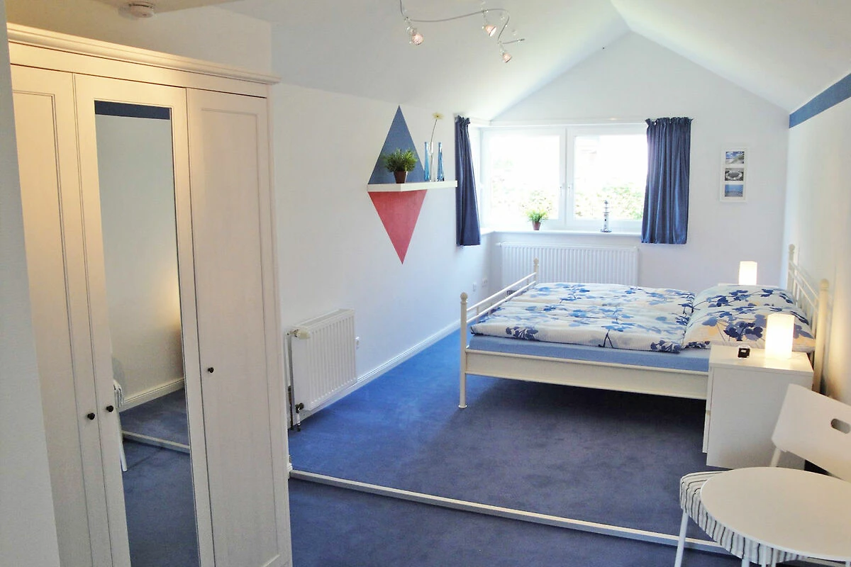 La casa vacanze dispone di due camere da letto separate al piano superiore, ognuna dotata di armadio a muro, sedia da spogliatoio e letti matrimoniali (180 x 200 e 160 x 200). L'elegante bagno completo è dotato di doccia/vasca/WC, spazio sufficiente per riporre gli oggetti e scalda asciugamani. La casa dispone anche di un secondo bagno per gli ospiti al piano terra, in modo da non intralciarsi a vicenda anche al mattino quando la casa è completamente occupata.