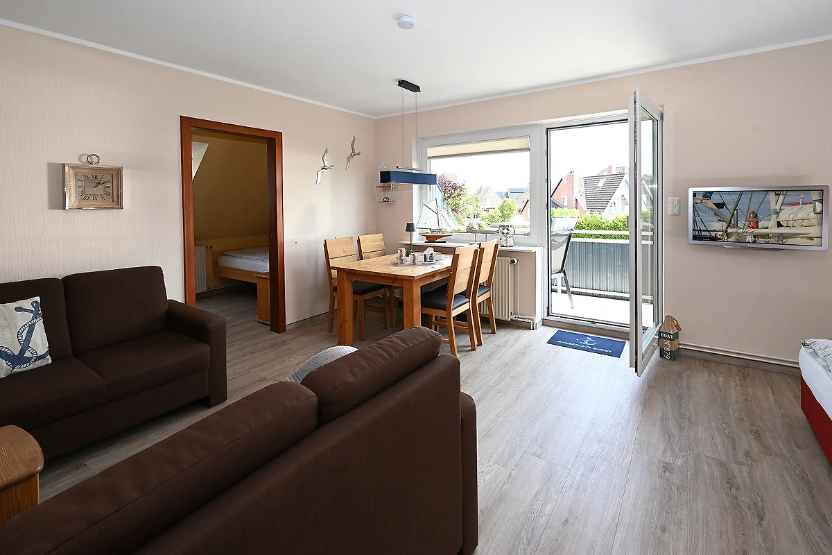 Il nostro soggiorno-letto è dotato di un comodo letto a molle, due divani doppi con tavolino e un grande tavolo da pranzo con 4 sedie. Sulla parete si trova una TV satellitare Ambilight, che può essere girata in qualsiasi direzione. Da qui si accede al balcone con orientamento est-sud, dove si ha una vista sul Rosengrund e sui dintorni e si può godere del sole del mattino fino al tardo pomeriggio. Nella camera da letto ci sono due letti singoli con lunghezza extra. Nella cucina separata si trovano un forno, un frigorifero con scomparto freezer, un forno a microonde, una macchina per il caffè e tutti gli utensili di uso quotidiano. Il bagno è dotato di doccia, WC e lavabo.