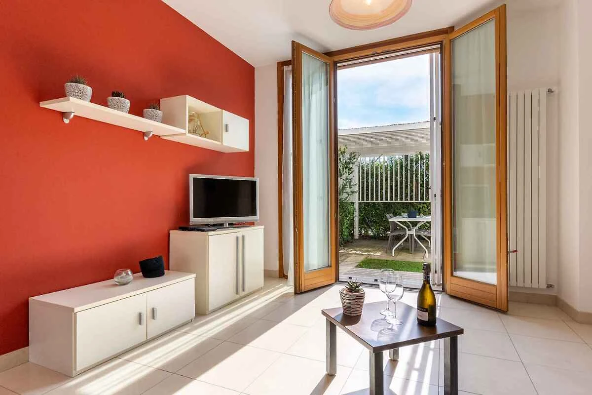 Rosolina RO. La casa vacanza si trova in una trama del giardino aperta con prato e alberi. Il proprietario non abita nella casa o nella proprietá. L'isola di Albarella dispone di diversi tipi di alloggi: piccoli appartamenti, case a schiera, case bifamiliari, grandi ville con piscina. Si trovano nel centro turistico. Albarella è un'isola privata nella laguna a sud di Venezia. Qui puoi optare per una vacanza rilassante o dedicarti al tuo sport preferito.