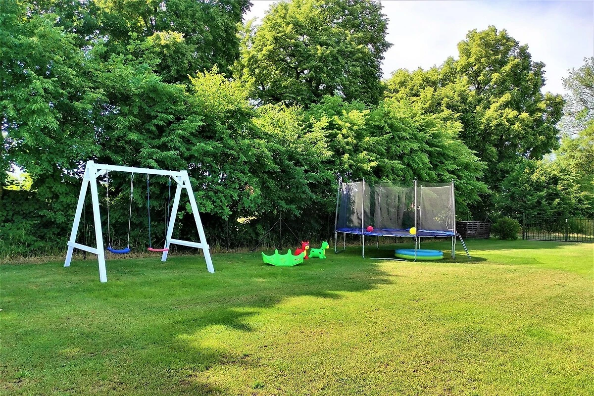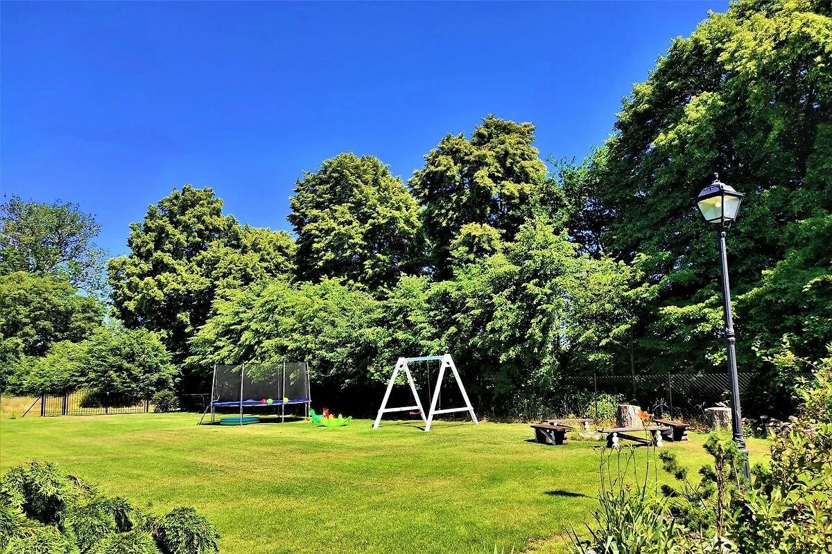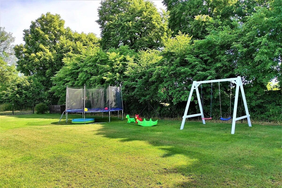 terrazza, giardino(recintato, curato), mobili da giardino, barbecue, parcheggio, tappeto elastico, giochi per bambini, scivolo